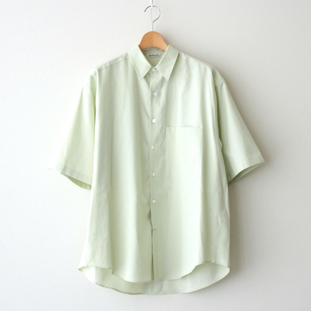 ゆったりとしたリラックスシルエットの半袖シャツ。衿はレギュラーカラー仕様。バックヨークの左右にタックを入れることで肩周りの可動域を広げ、快適な着心地を実現。前立ての釦には高級感のあるシェルボタンを採用しています。