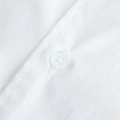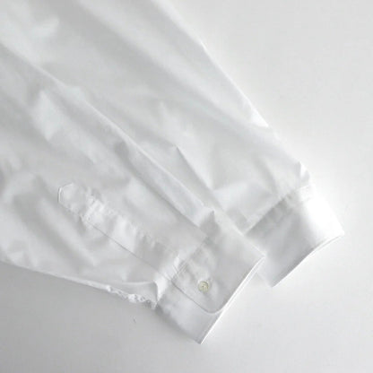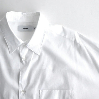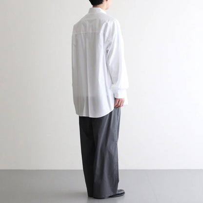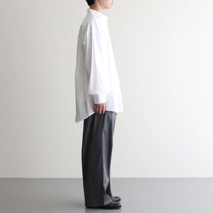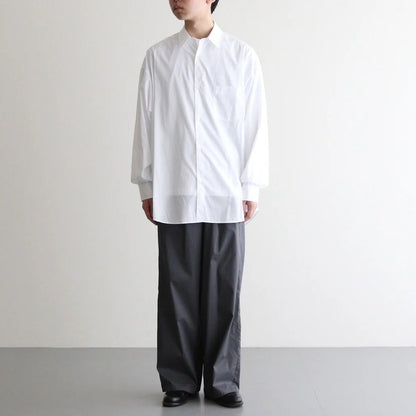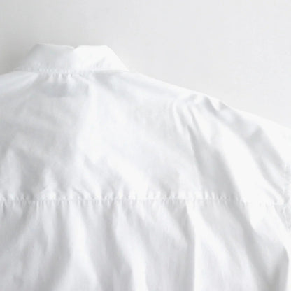 身幅と肩幅を広くとり、肩を落として着るオーバーサイズのボックスシルエット。ゆとりを持たせた心地の良い着用感と、自然なラインが特徴の一着です。衿はレギュラーカラー仕様。袖口はシングルカフス、袖先にタックを入れることで丸みを持たせ納まりの良いシルエットに。バックヨークの左右にタックを入れ、肩周りにゆとりを持たせることで動き易さを考慮した作り。各部分のボタンにはシェルボタンを採用、左胸にポケット付き。