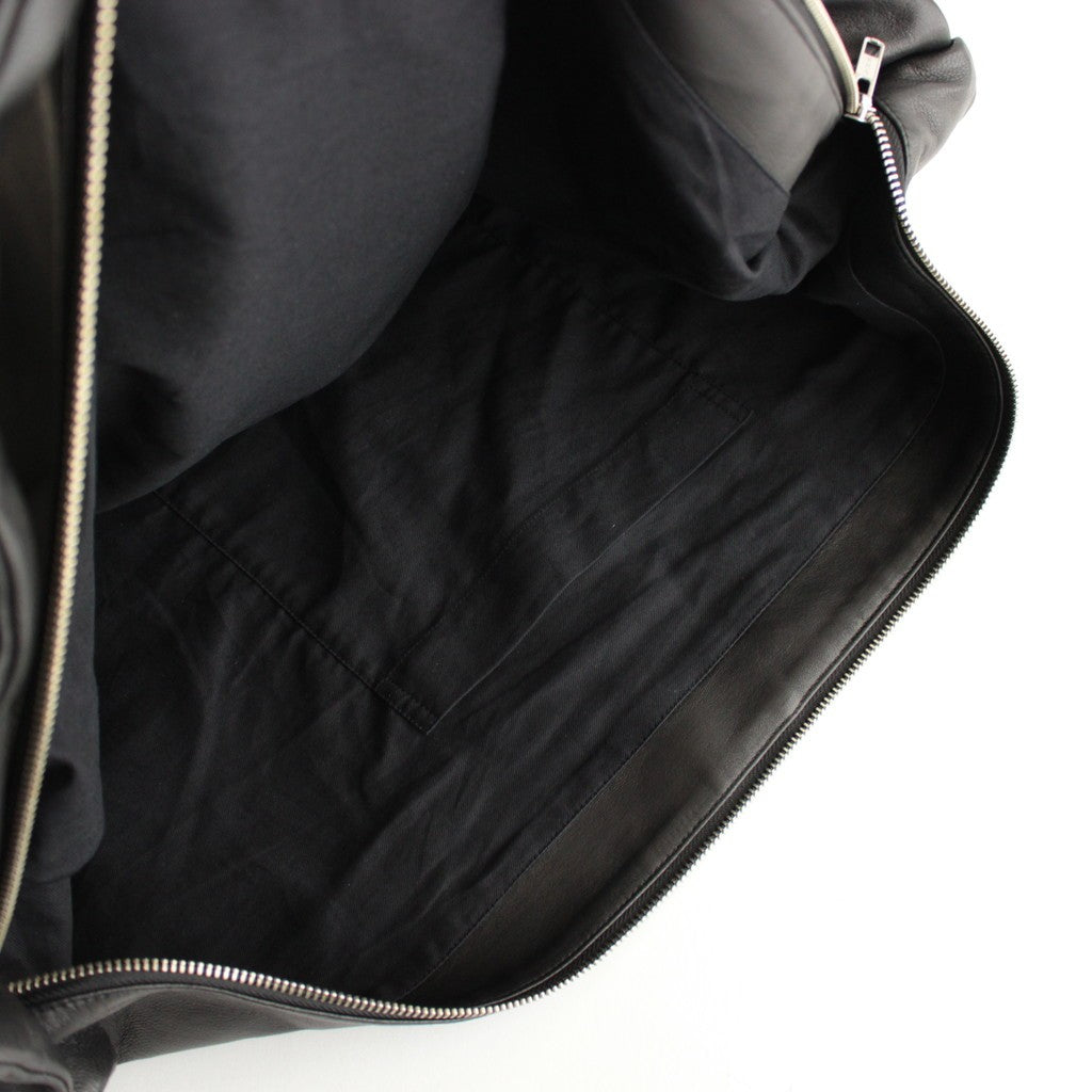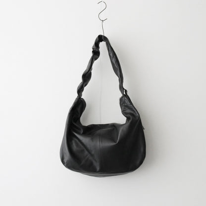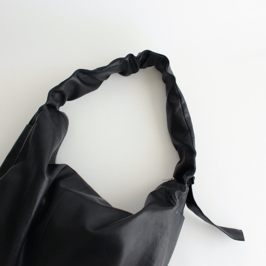 無機質なプロダクトを目指し、デイリーに使用出来るよう製作されたレザーショルダーバッグ。ショルダー内側にレザーベルトを施し、長さを調整することでショルダー部分にギャザーが寄るように設計。