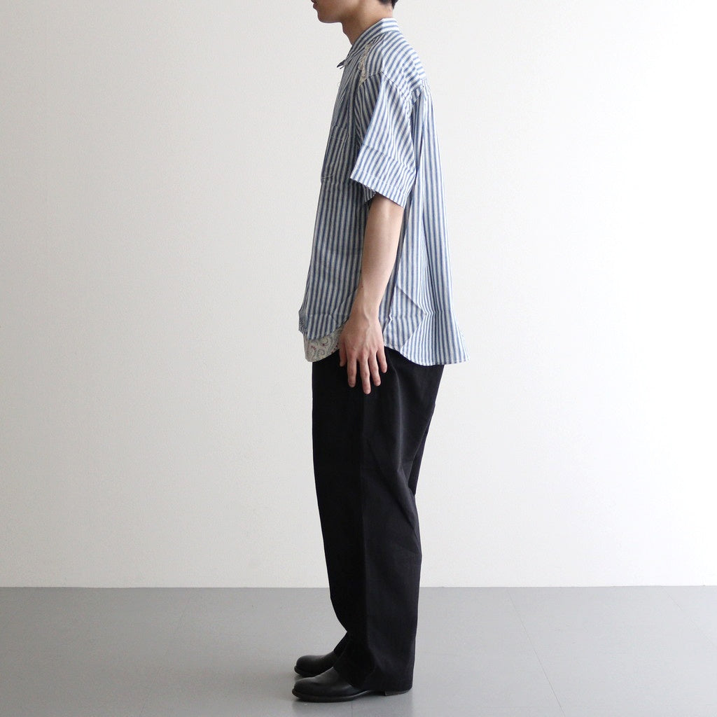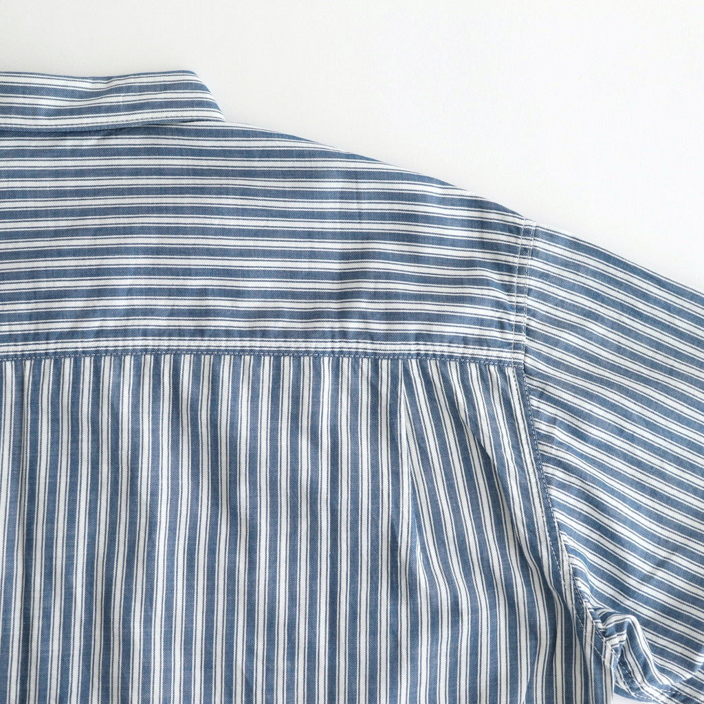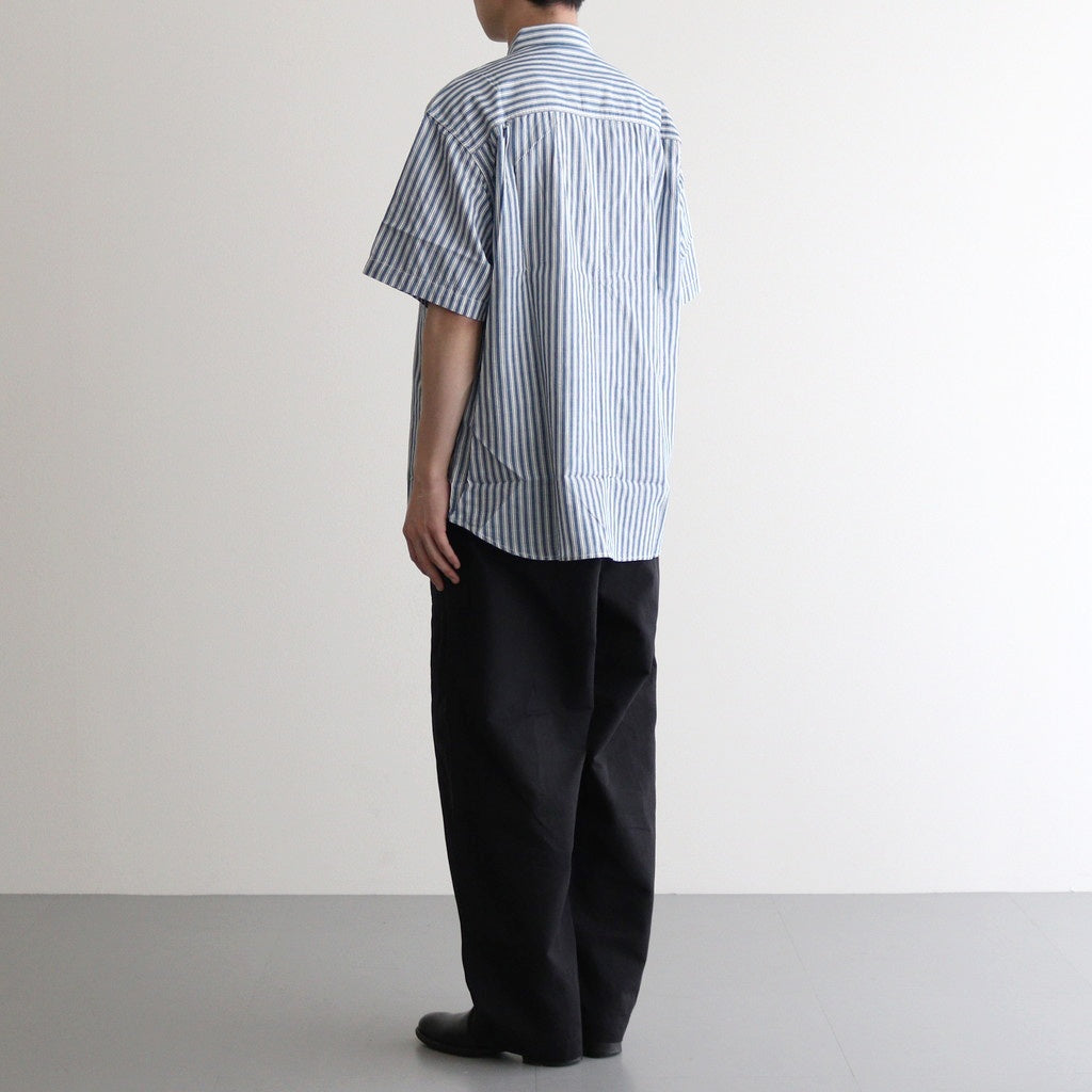 全体にほどよくゆとりを持たせたワイドシルエットの半袖シャツ。小ぶりな襟に袖はセットインスリーブ。肩回りの縫製部分や裾に別生地を使用し切り替えたデザイン。シンプルなストライプシャツに生地の切り替えが入ることで程よくアクセントになった一着です。