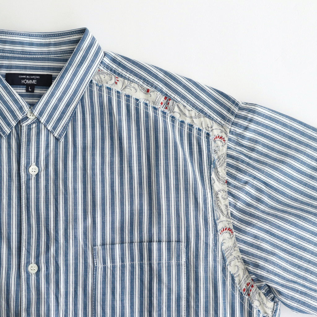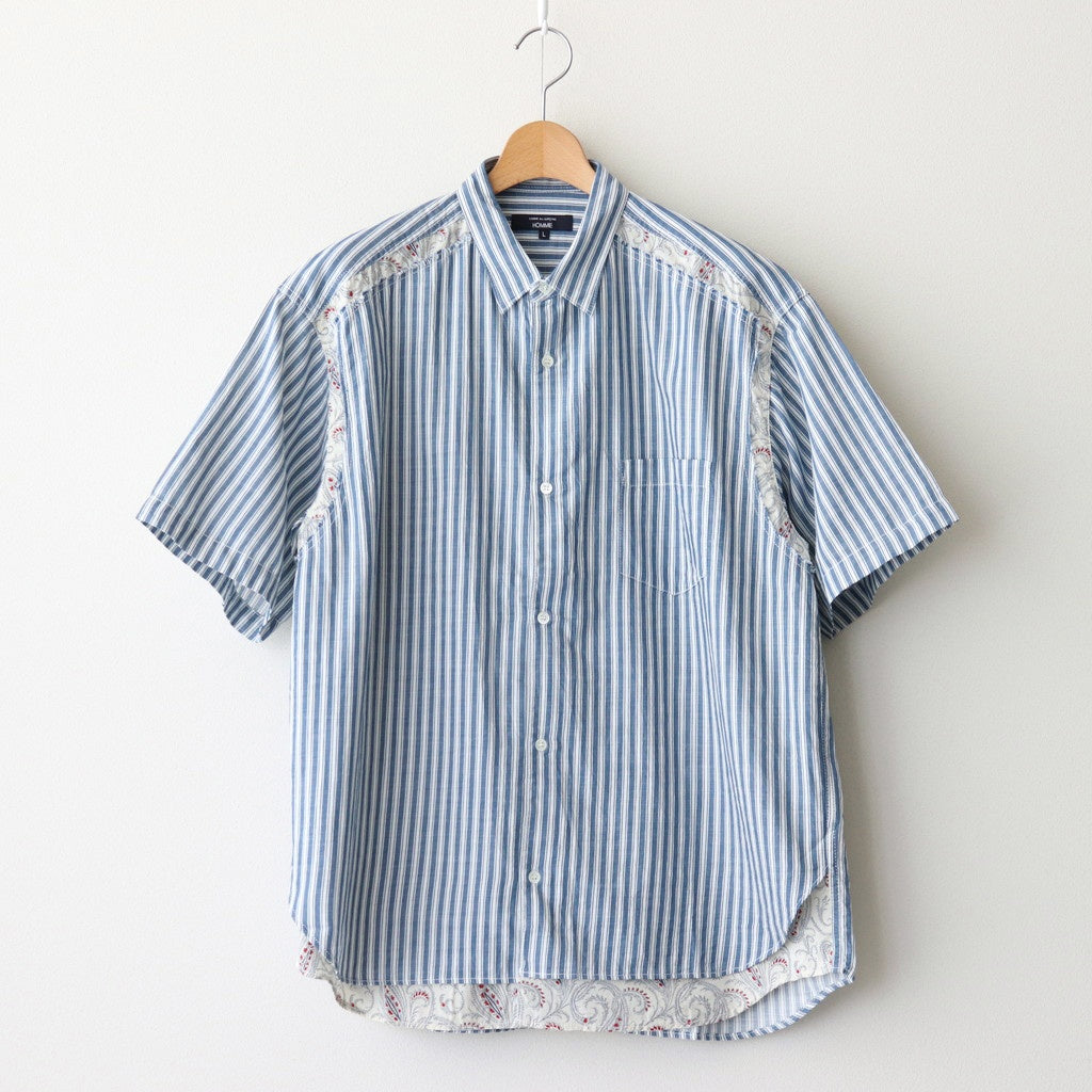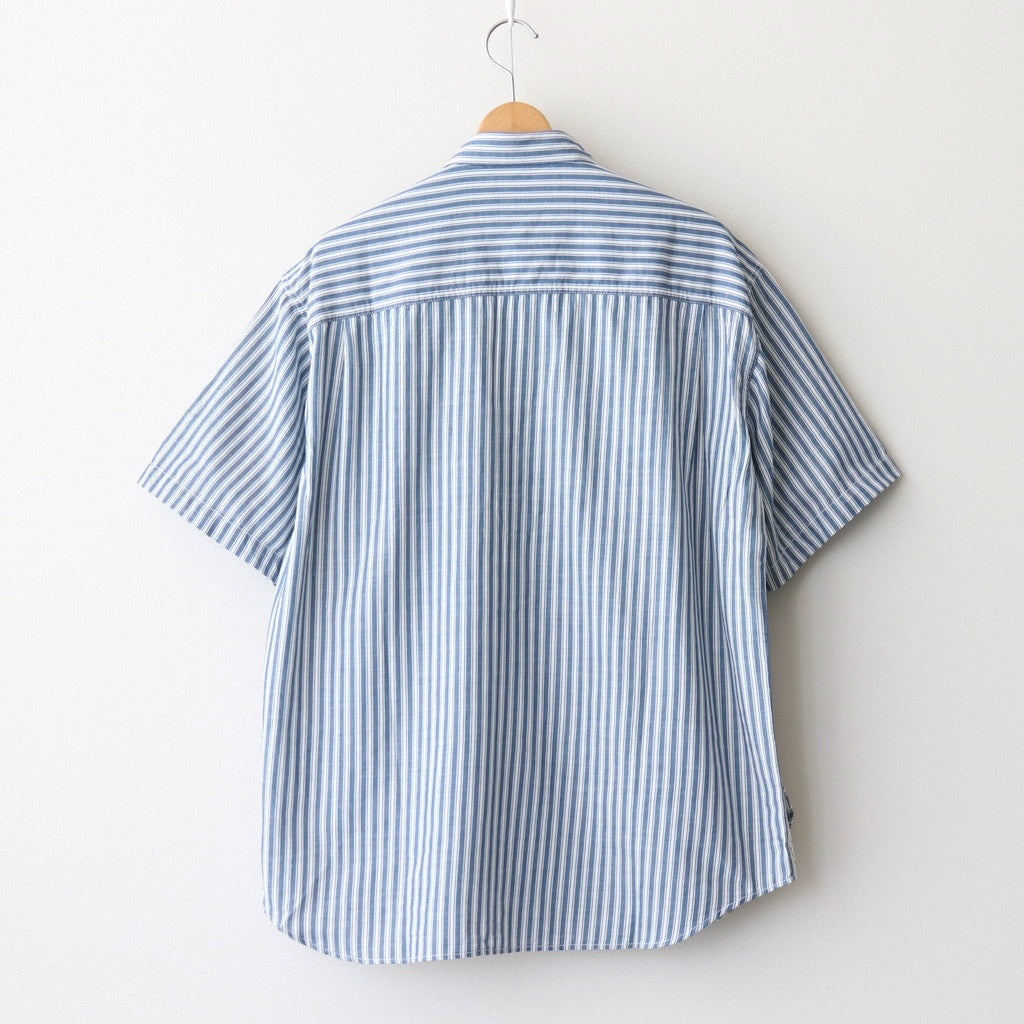 全体にほどよくゆとりを持たせたワイドシルエットの半袖シャツ。小ぶりな襟に袖はセットインスリーブ。肩回りの縫製部分や裾に別生地を使用し切り替えたデザイン。シンプルなストライプシャツに生地の切り替えが入ることで程よくアクセントになった一着です。