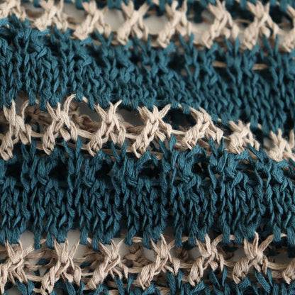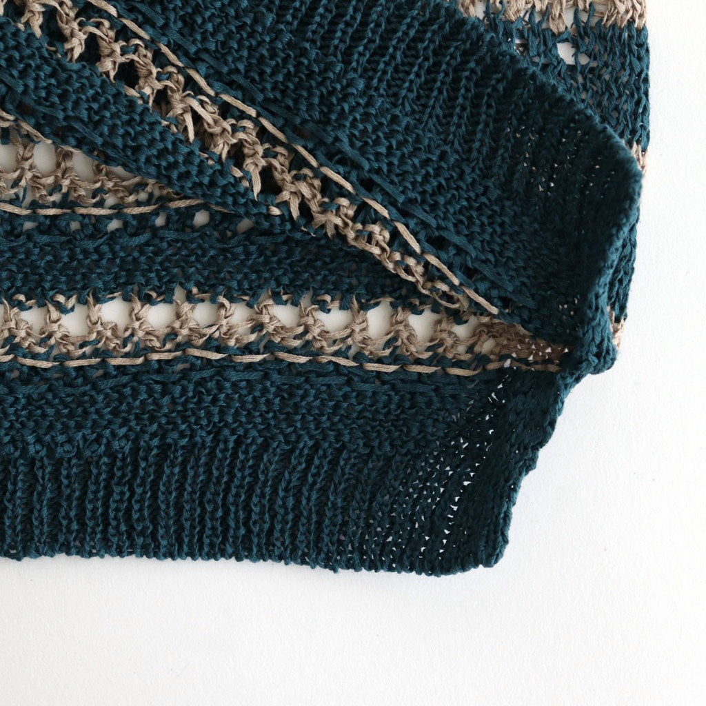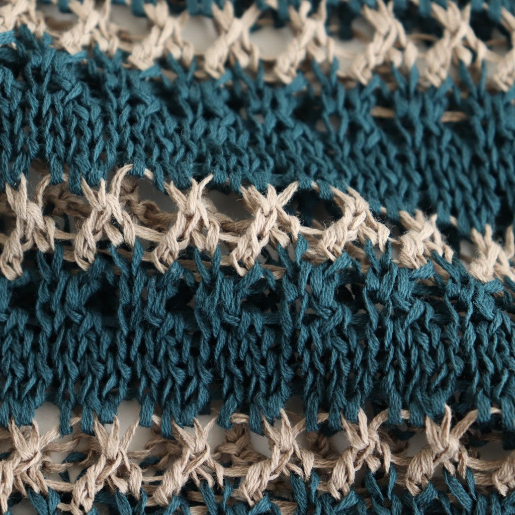 細番手のコットン糸を使用。ギマ加工と呼ばれるコーティングを行うことで、麻のような質感を持った扁平形状のテープヤーンに仕上げています。独特の張りと肉感があるため非常に軽い着心地。また糸が正円でなくテープ形状になっているため、編地によって見える角度の違奥行のある風合いです。