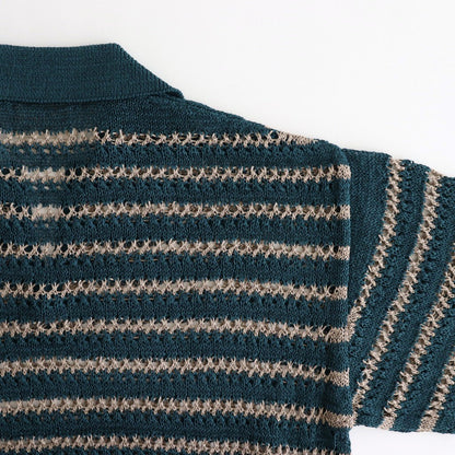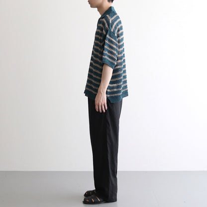 程よくゆとりのあるスキッパー仕様の半袖ポロシャツ。肩幅を大きくとったドロップショルダーのセットインスリーブ。袖も長めで肘を覆うようなシルエットに。2色の糸を組み合わせることで特徴的なボーダー柄を表現しています。