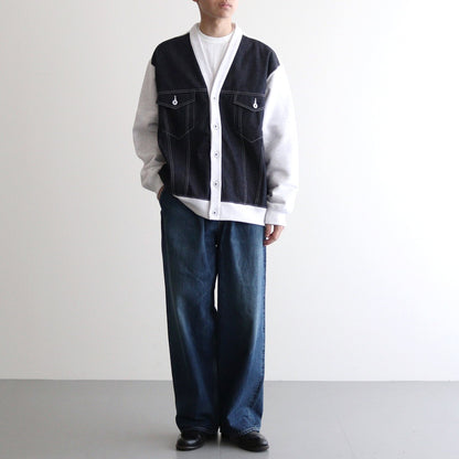 全体にほどよくゆとりを持たせたワイドシルエットの異素材MIXカーディガン。身頃にデニム生地を使用し、それ以外の箇所をスウェットに切り替え。デニム部分にはリーバイスの3rdタイプを彷彿とさせるV字ガゼットを使用しておりステッチカラーにはホワイトを採用。フロントはボタン開閉式となっており、ブランドの刻印が入ったドーナツボタンを使用しています。