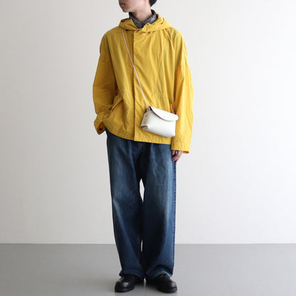 「ナイロンタッサー/ガーメントダイ」テキスタイルを使ったショートモッズコート。タッサーは平織りの一種で緯糸にやや太番手の糸を使用して、横畝の表情を出した生地です。タッサー織の為、少し横畝があり、起毛加工が施されているのでナイロンでありながらソフトなタッチの風合いに仕上がっています。ふくらみが出て軽さのあるボリュームの出る生地感。製品染めを施しており、パッカリングが大きく出ることと巻き縫いをはじめとする縫い目部分に色が入らずにやや薄くなっていたり、やや色ムラのように見える場合もありますが、これらはこの生地の特徴です。製品洗いと製品染め、タンブラー乾燥を施す事で程良く力の抜けたカジュアルな雰囲気がありながら、どこか落ち着いた大人な印象を与えてくれます。フロントは比翼仕立ての5B仕様、腰の位置にフラップ付きの両玉縁ポケットを配置。肩周りや身幅をたっぷりと広めにし、丈感でバランスを調整したゆったりとした心地の良いオーバーシルエット。ウエストに配したドローコードを絞る事でシルエットのアレンジが可能です。