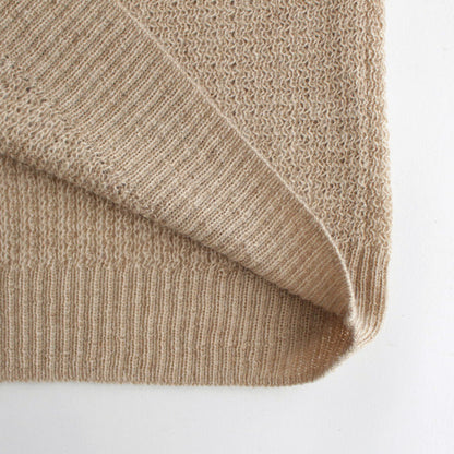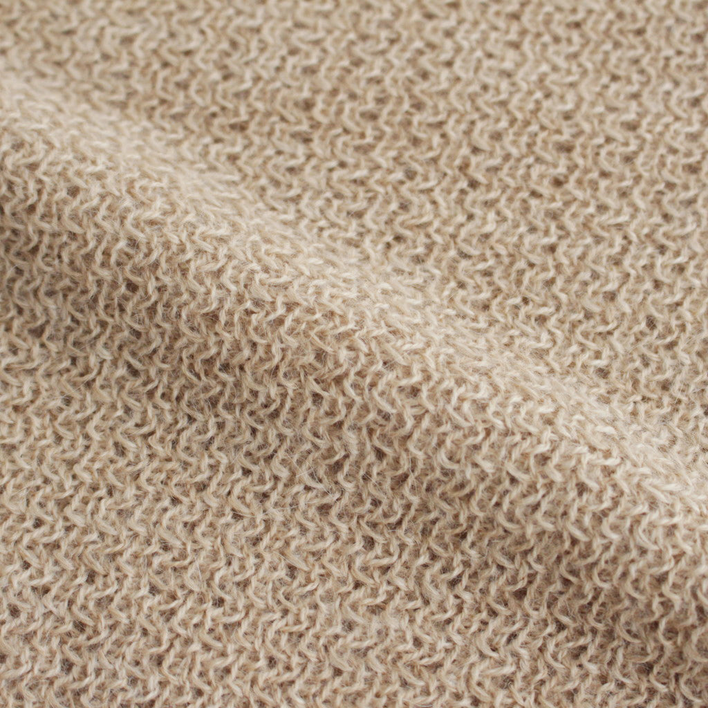 油分を豊潤に含むベビーアルパカ素材を使用。肌との密度を極限まで詰めるため、特殊な加工を施すことで最上の手触りを実現したニットです。編地を完成させた後、水のなかで時間をかけて編み地を丁寧に揺らし続けることで、ニット表面の最も柔らかく軽い毛だけを起毛。この柔らかく軽い毛が表面に立つことで肌触りが柔らかく、繊細な落ち感を実現しています。