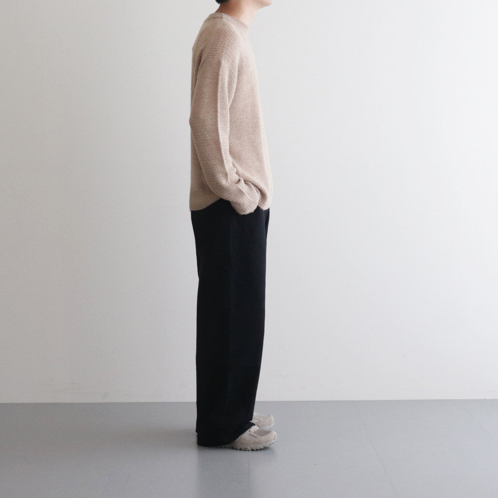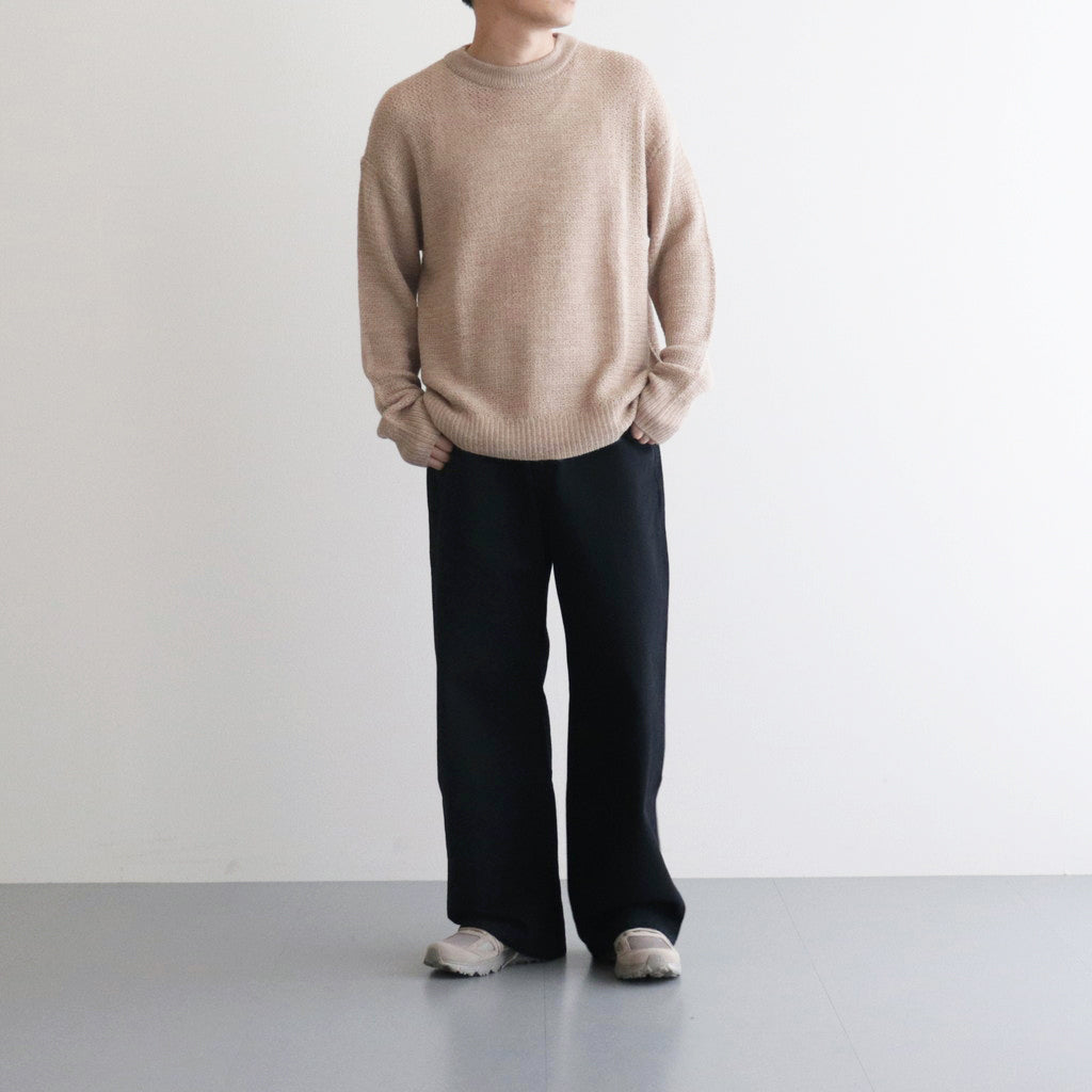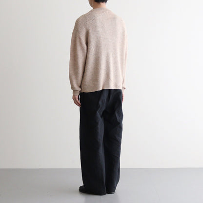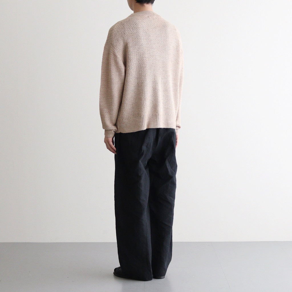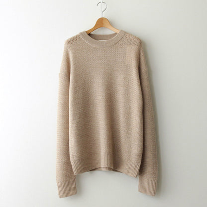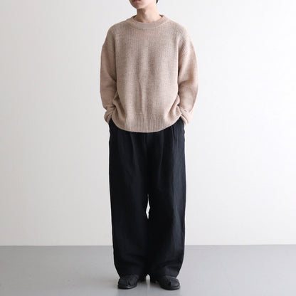 普遍性とデザイン性を両立したシンプルな丸首セーターです。ほどよくゆとりのあるシルエットで仕立てられており、襟・裾・袖先はリブ編みに切り替え。アームホールは太くなりすぎないよう調整されたすっきりとした作りに。また太さに反して袖丈は少し長めに設計することでほどよくルーズな雰囲気をプラスしています。