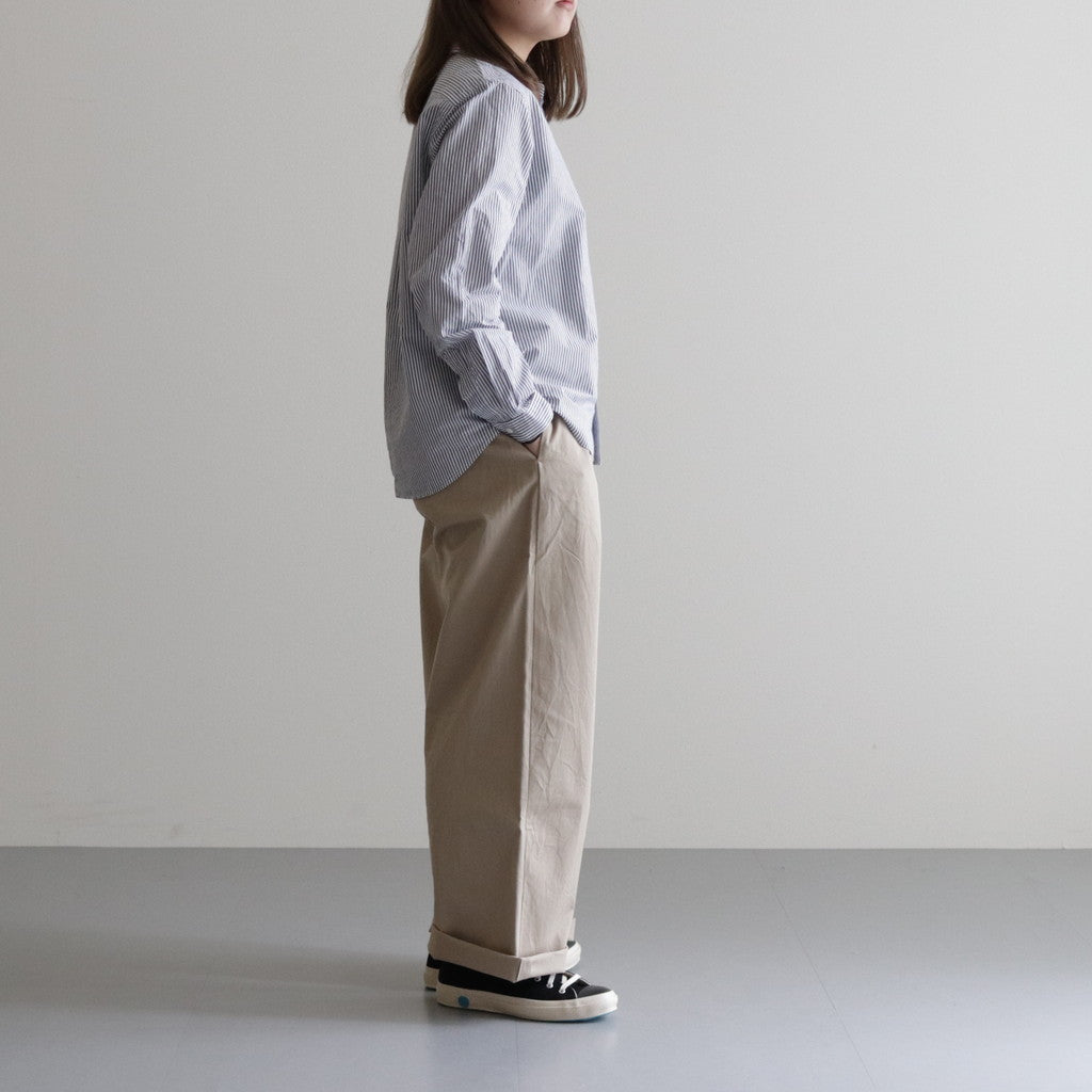 洗いざらした自然なシワ感が優しい印象のコットンタイプライターを使用。平織りで高密度に打ち込むことで張りを持たせつつ程よい柔らかさがあり、心地の良い着用感と清潔感のある佇まいがお楽しみいただけます。素肌にも着心地の良いサラッとした肌触りでオールシーズン着用可能です。