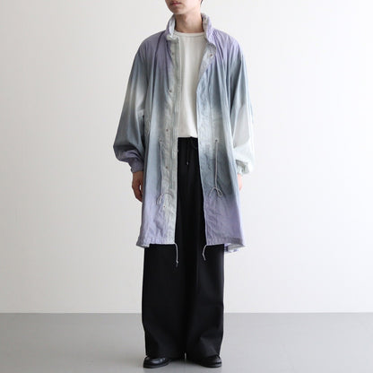 防寒性の高いスタンドカラーの内側にフードを収納することができ、フロントはスナップボタンとダブルジップで開閉できる2重構造。腰の位置にフラップポケットを配置し、背面の裾にはM-65PARKAを感じさせるフィッシュテールのデザイン。袖先の内側にゴムを配すことで風の侵入を防ぎ、タブとアジャストボタンでサイズ調節可能。ウエストに配したドローコードを絞る事でシルエットのアレンジに。肩、身幅やアームホールなど全体的にゆったりしたサイズ感でジャケットなどの上から羽織ることができるオーバーコートらしいシルエット。1枚でコーディネートの主役になってくれる存在感のある1着です。