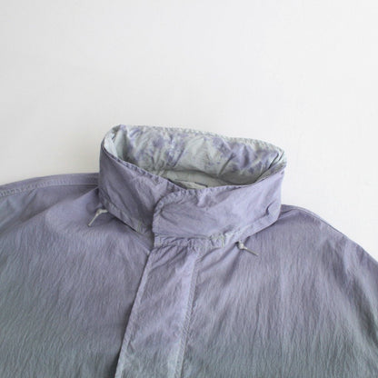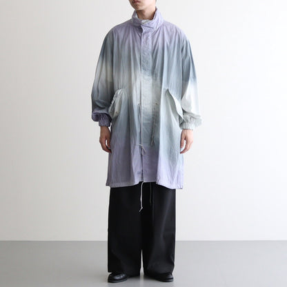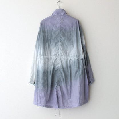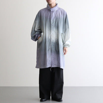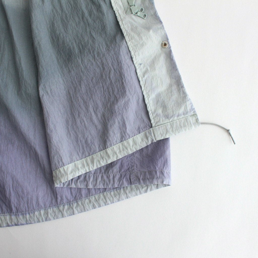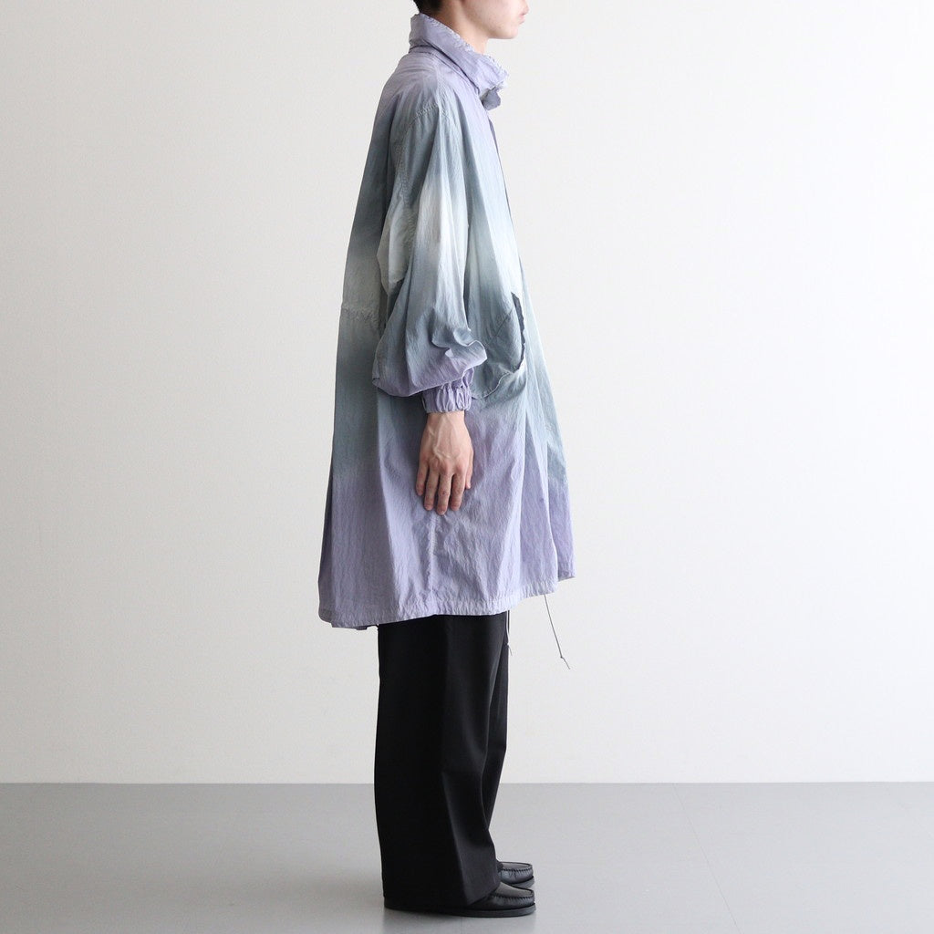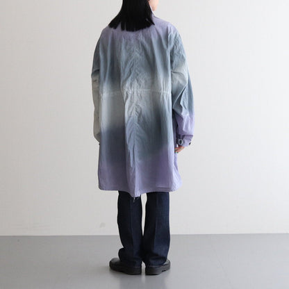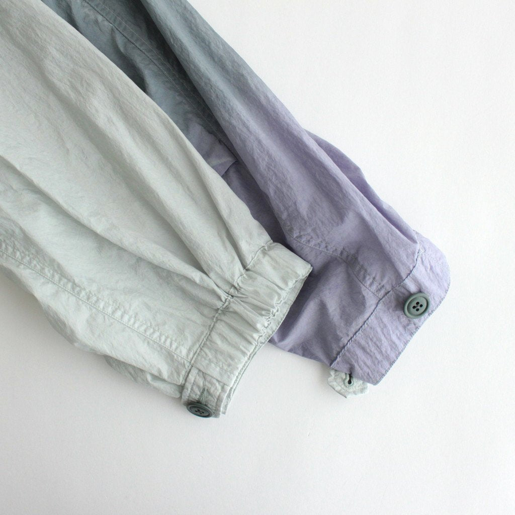 生地には小松マテーレの50Dの軽量ナイロンタフタを使用。とても軽くてシワになりにくいナイロンタフタは薄手でサラッとしていて爽やかな肌触りです。高密度に織り上げられており、目の詰まったキメの細やかな表面感が上品でモダンな佇まいに。23SSシーズンのテーマであるヘレン・フランケンサーラーの作品にみられる色の滲みを表現するために、製品染とスプレー染色加工で染め上げています。