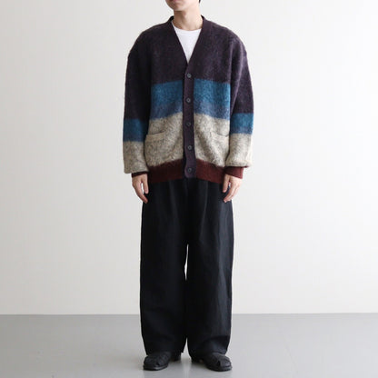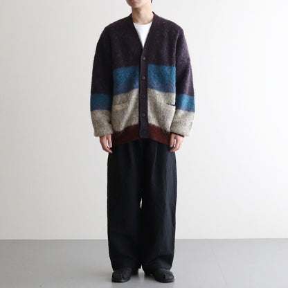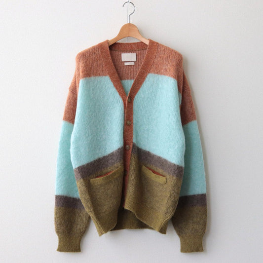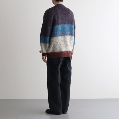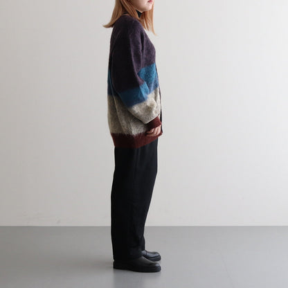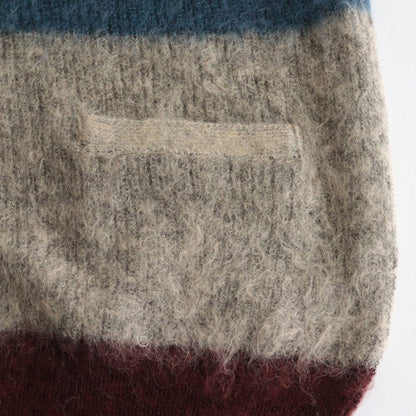 采用 Ben Nicholson 作品的配色方案编织。这款针织品采用马海毛制成,被称为 Tam Tam 纱线。马海毛是安哥拉山羊的毛发,鳞片(纤维表面的鳞片)比羊毛小,因此质地光滑柔软,毛发具有优雅的光泽。马海毛婴孩纱用于表现作品的氛围,经过加高和模糊处理,使边界不那么明显,然后收缩,使其具有旧马海毛的感觉。(通常,加高工序在收缩工序之后进行)。针织品具有独特的外观和触感,卷曲的毛皮是在整个产品经过加高处理并带出毛皮后,通过进一步的收缩工序表现出来的。