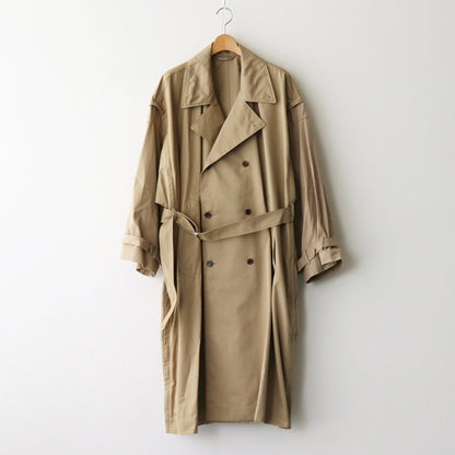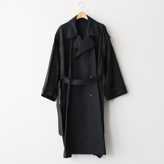 身頃と袖のパーツを逆開ファスナーで着脱可能にした脱構築的なトレンチコート。全てを外してベストとして着用したり上だけファスナーを下ろして袖を通して着用したりと様々な着方の出来るコートです。全体はゆったりとしたシルエットで製作されており、インナー次第では長いシーズン着用することのできる一着です。