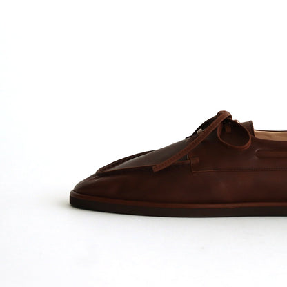 ニュージーランド産原皮をイタリアタンナーで鞣したベビーカーフを採用。きめの細かいしっとりとした質感と、薄く漉いた繊細な風合いのレザーが品のある一足。ゴム底で強度を保ちつつも非常に軽やかなレザーシューズに仕上がっています。履き始めから足馴染みも良く、極上の履き心地がお楽しみいただけます。