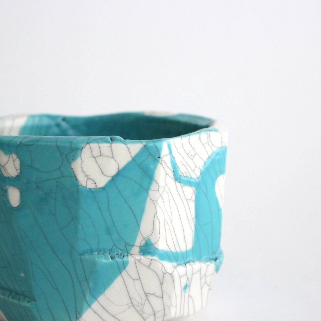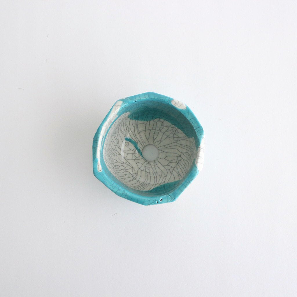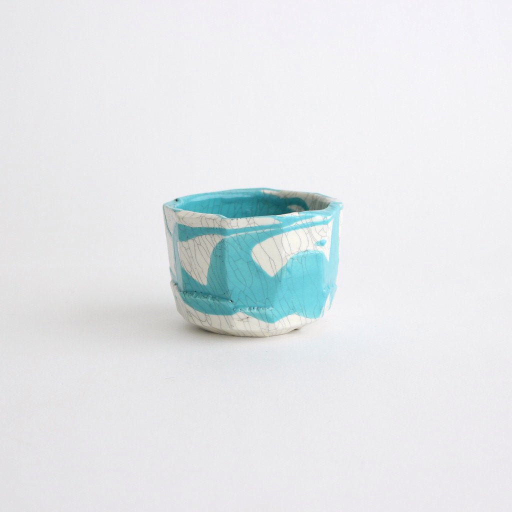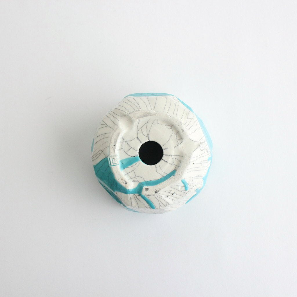 白や黒、ターコイズを基調とした、天然石の様な風合いを持つうつわを中心に、コンテンポラリーな作品を作陶する苫米地正樹。そんな彼がチャクラのために特別な鉢を作成してくれました。インディアンジュエリーに強い影響を受ける彼の作品は、釉薬と土の収縮の違いにより生まれるひび割れ『貫入(かんにゅう)』に墨を流し込むことで、トルコ石に見られる模様『スパイダーウェブ』の様な風合いを表現しています。今回出来上がった鉢は焼き物の表情豊かな質感をベースに岩のようなゴツゴツとした面を出し、側面の無作為なカッティング、苫米地氏らしい鮮やかなターコイズブルーが施されたモダンで洗練された至極の鉢です。鉢としてはもちろん単体でお部屋においてもインテリアやオブジェとしての芸術的な作品としてもお楽しみいただけます。底面には排水用の孔が空けられているので、水遣りの頻度を変えることで乾燥した状態・水分の多い状態など、植える植物の特性にも対応しやすい鉢となっています。贈り物としても喜ばれる、とても素敵なプロダクトです。