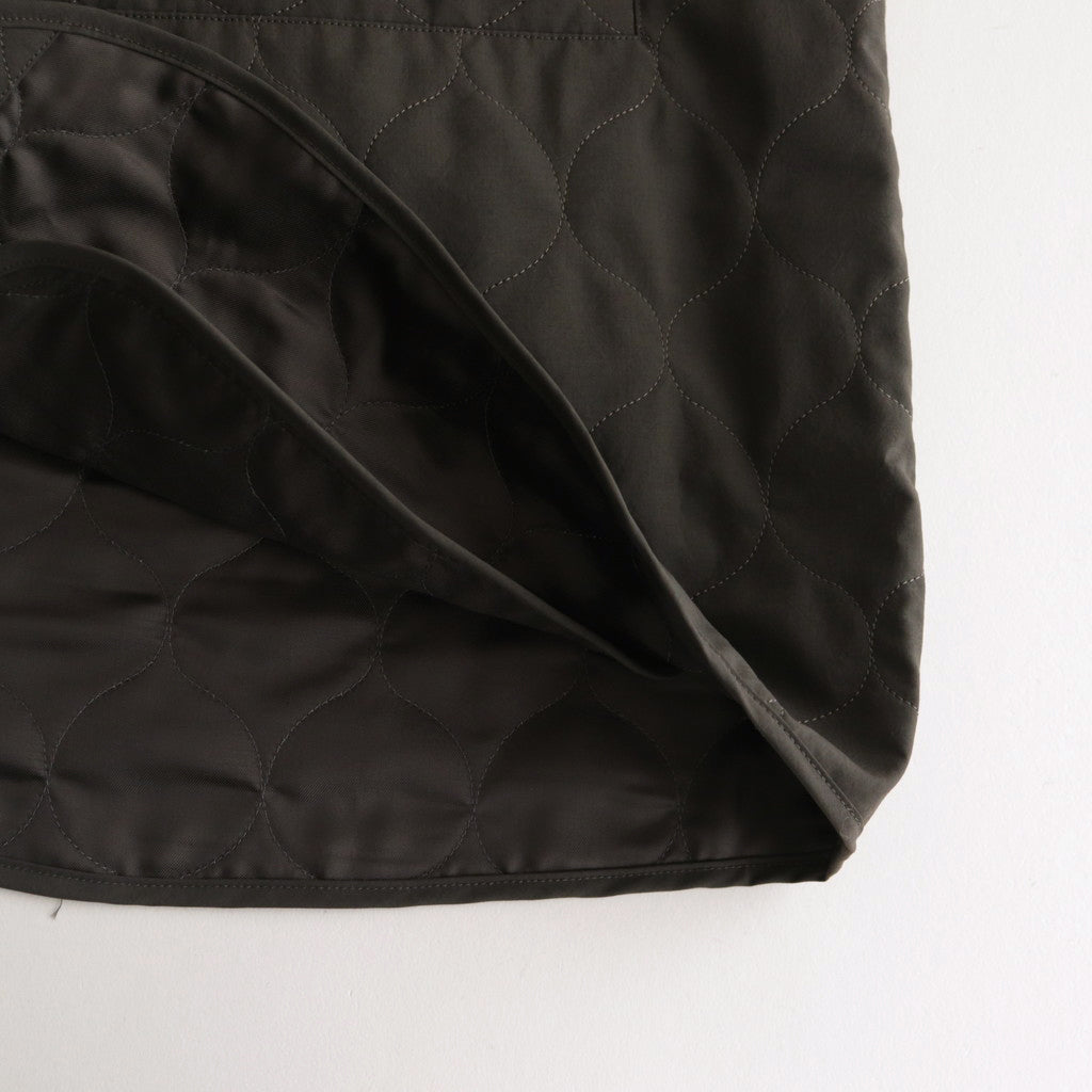 中綿にコマサーモという機能中綿を内包したキルティング生地。表地にはコットンのような表情のポリエステルタイプライター生地を使用。ワッシャー加工を施すことによって天然繊維のような表情を持ち、抗ピリング性に優れた生地に仕上げています。中綿のコマサーモは軽量且つ充分な保温性を兼ね備えた機能素材。湿気を吸って発熱するなど高い保温性が特徴的。裏地は平滑なポリエステルファブリックを貼り合わせ、細かいステッチでキルティングしています。ご自宅で水洗いもできるなどケアが楽なのも嬉しい点。