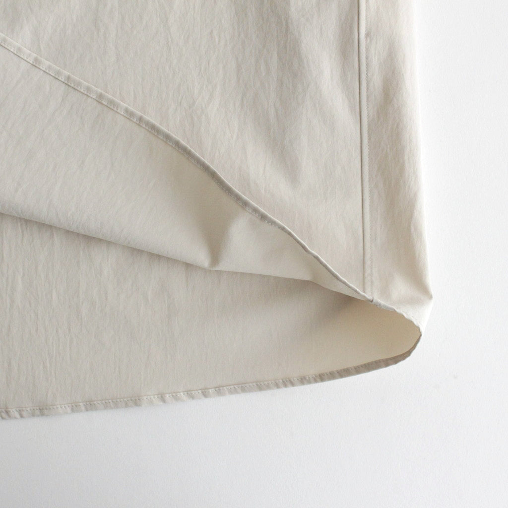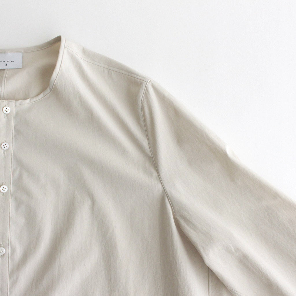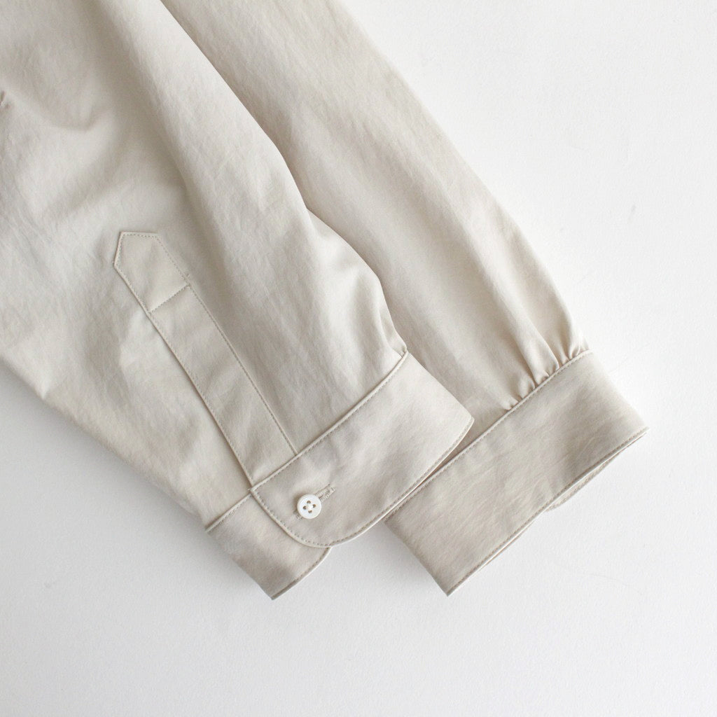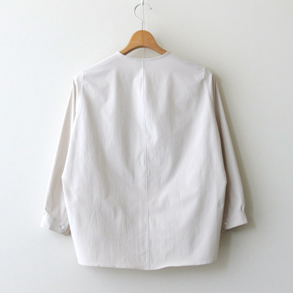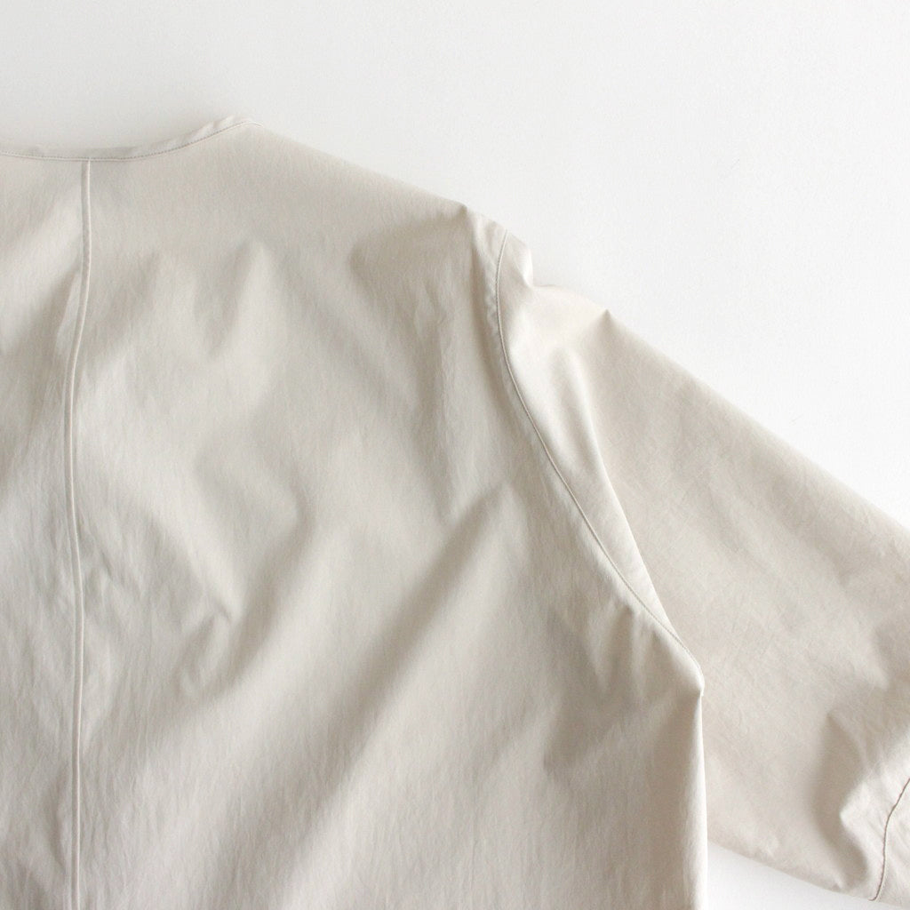 肩周りやアームをスッキリとさせ、身幅にゆとりを持たせたリラックスシルエット。裾を僅かにラウンドさせ、ゆとりのある身幅とバランスをとった独特の形です。衿はノーカラー仕様、袖口はシングルカフス。袖先にギャザーを入れることで立体的で納まりの良いラインに。
