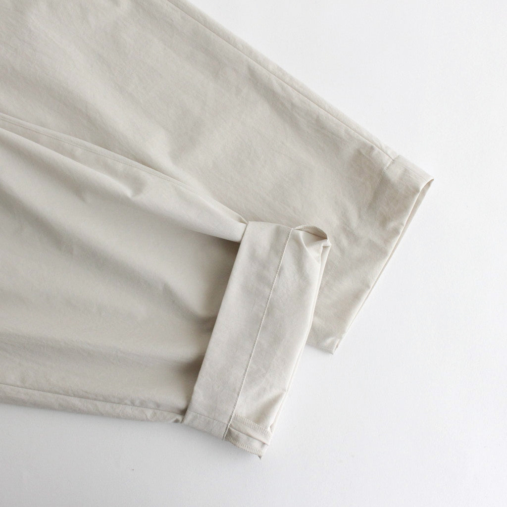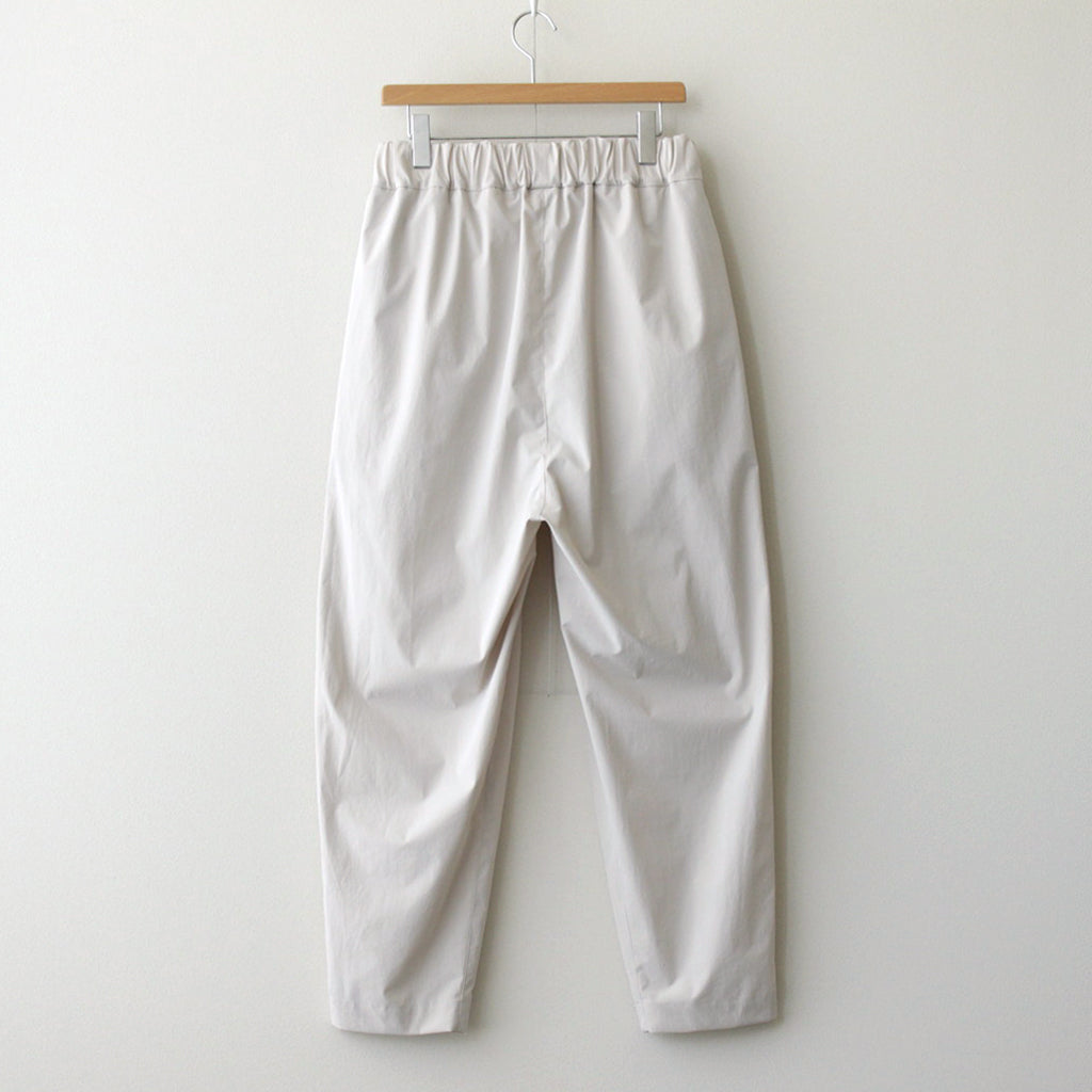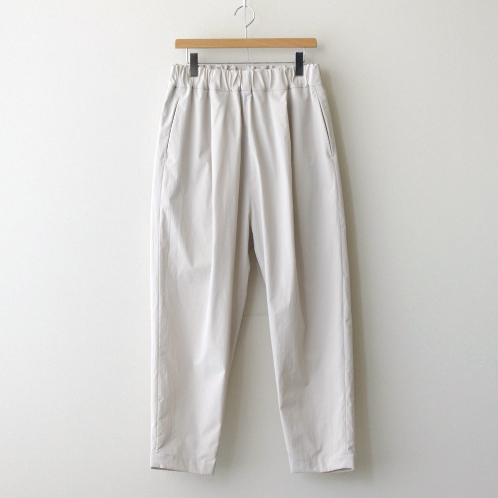 リラックス感のある腿回りから裾に掛けて強く絞りを入れ、すっきりとした印象に仕上げたイージーパンツ。フロントにアウトタックを入れ、独自のパターンにすることで丸みのある綺麗なシルエットを表現。長すぎず短すぎずのレングスに設定されているためウエスト位置を調節することでシルエットのアレンジが可能です。