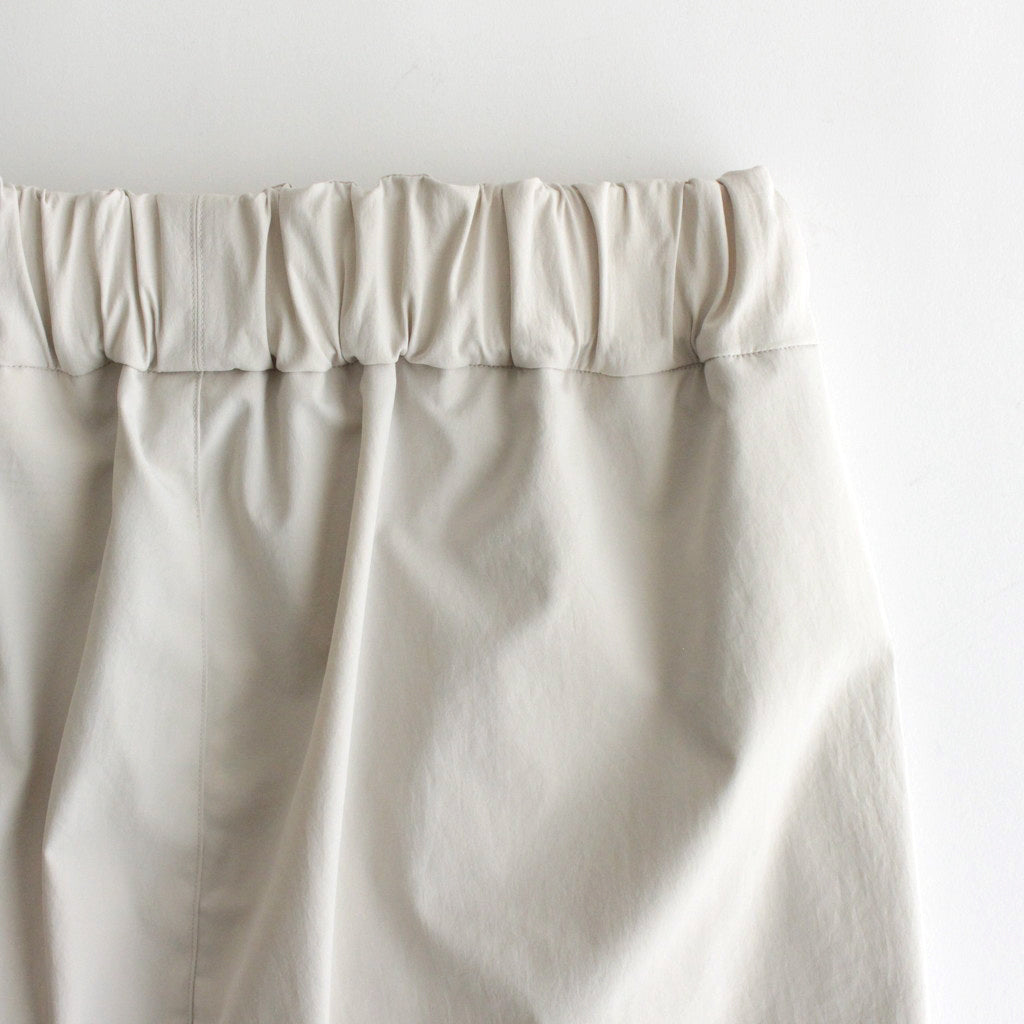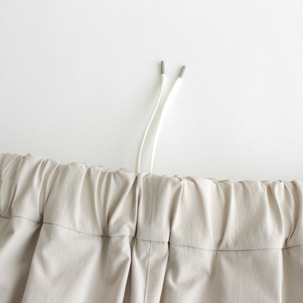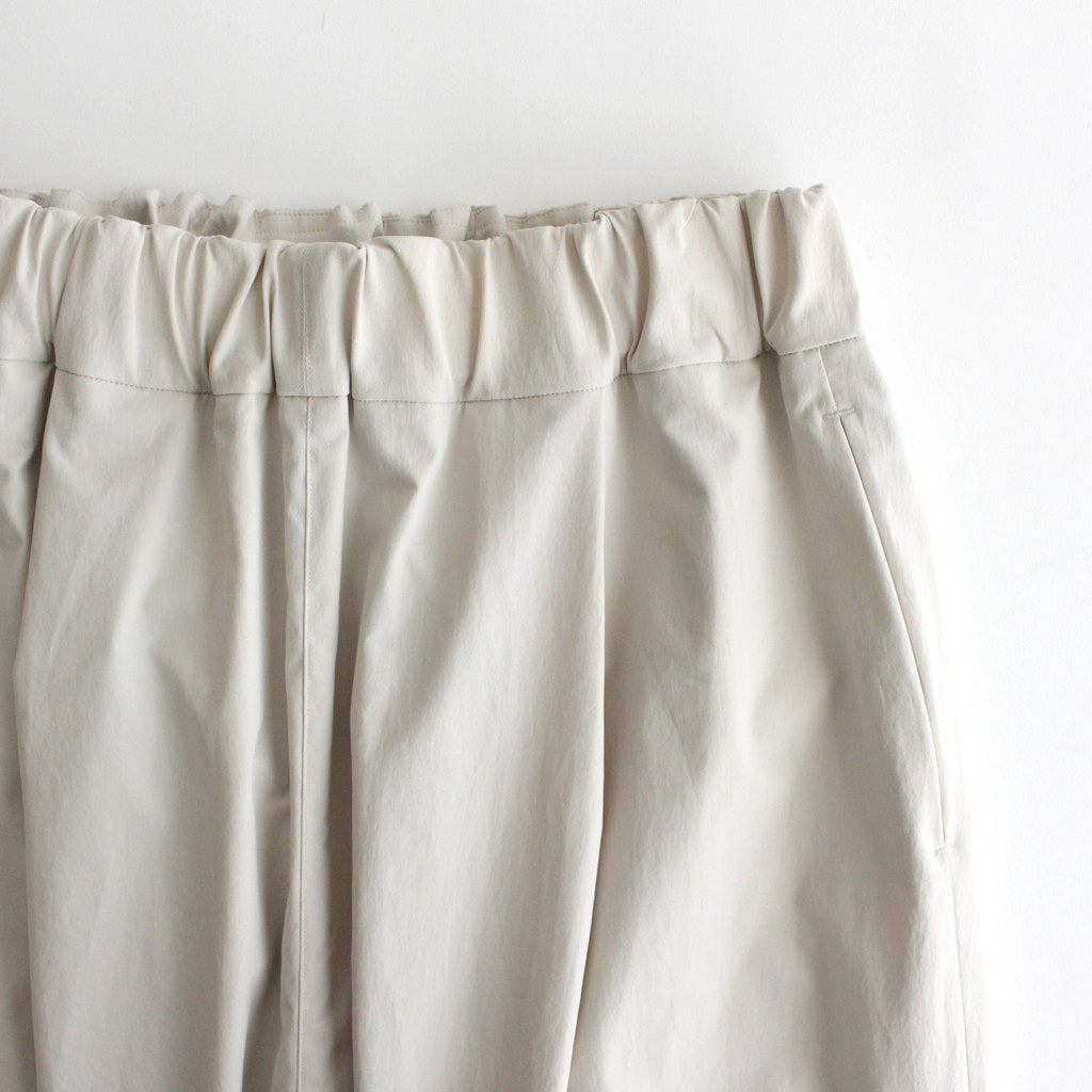 リラックス感のある腿回りから裾に掛けて強く絞りを入れ、すっきりとした印象に仕上げたイージーパンツ。フロントにアウトタックを入れ、独自のパターンにすることで丸みのある綺麗なシルエットを表現。長すぎず短すぎずのレングスに設定されているためウエスト位置を調節することでシルエットのアレンジが可能です。