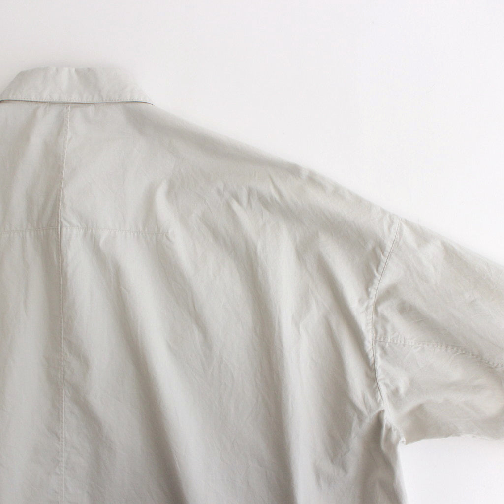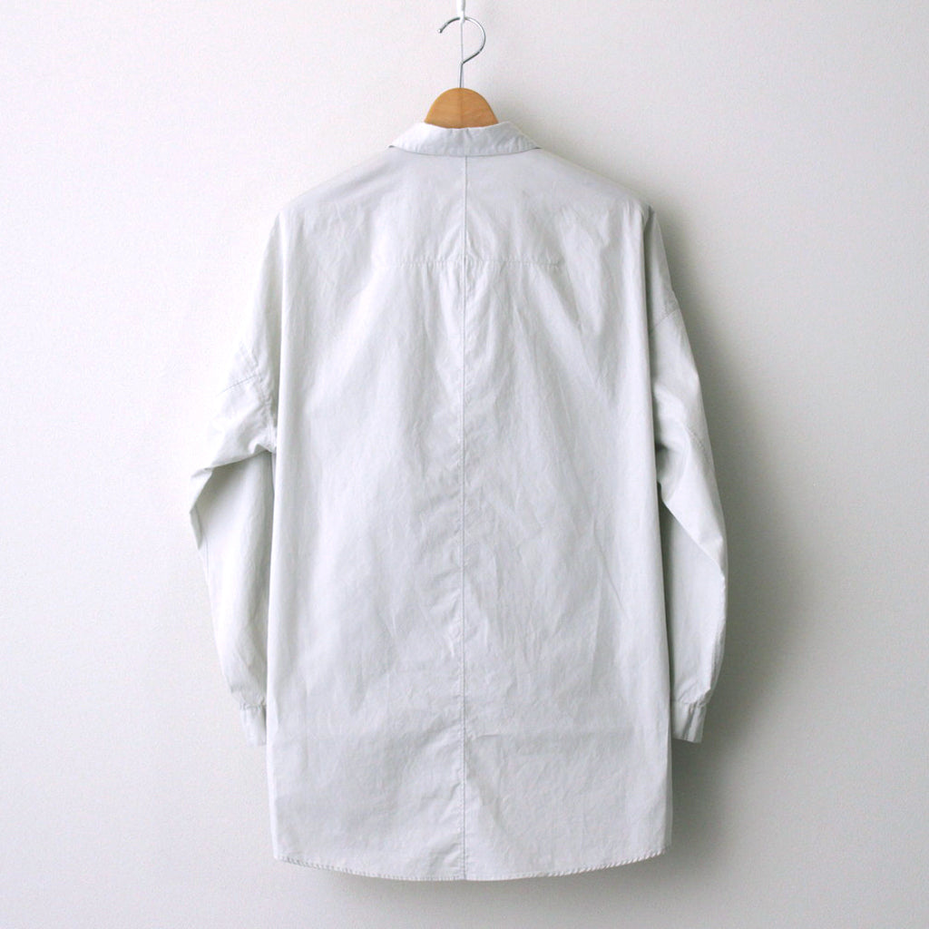 台襟付きの小ぶりのレギュラーカラー。肩幅を大きくとったドロップショルダー型のシルエット。身幅は広めですが袖周りをコンパクトにすることでバランスをとった一着。