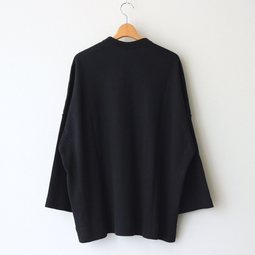 「交編ライトワッフルニット」テキスタイルを使ったビッグシルエットのクルーネックプルオーバー。綿とポリエステルの交編のワッフル生地のニットです。綿100%のワッフルと比べてポリエステルと交編しているため、ダレが少ない強度のあるワッフルになります。仕上げに製品洗いとタンブラー乾燥させることで、ワッフルの凹凸をさらに引き出しています。肩周りと身幅、アームにたっぷりとゆとりを持たせた、快適な着心地でリラックスした印象に仕上げたオーバーサイズのビッグシルエット。ワイドスクエアのスリーブが迫力のある着姿を演出してくれます。身頃と同じ生地でバインダー処理を施した程良い広さのネックラインも特徴的。袖先と裾は折り返して縫製することで耐久性を向上させています。脇線に沿った裾に浅めのスリット入り。細かく整列した丁寧なステッチもこのプルオーバーの良さで、直接肌に触れてもストレスを感じないところもFIRMUMのこだわり。コーディネートにも取り入れ易く、長く愛用して頂ける一枚です。