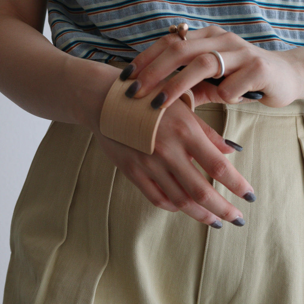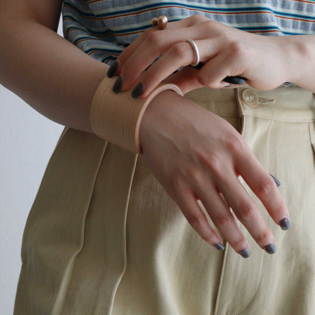 _Fotのバングル。薄い木を一枚ずつ積層させた「プライウッド」という曲木の技術を用いて成形された“ plywood ” シリーズ。職人の手によりひとつひとつ仕上げられ、木のぬくもりを感じられる温かみのあるデザインです。素材にはウレタン加工が施された天然木を使用し、汚れや水をはじく機能性も備えています。また、天然素材特有の経年変化を楽しむことができ、使い込むほどに愛着の湧く一品です。天然素材を使用し、手作業により製作している為、一点ごとに色味や風合い、木目など個体差がございますことをご了承くださいませ。長時間、水に浸けておく事はお控えください。