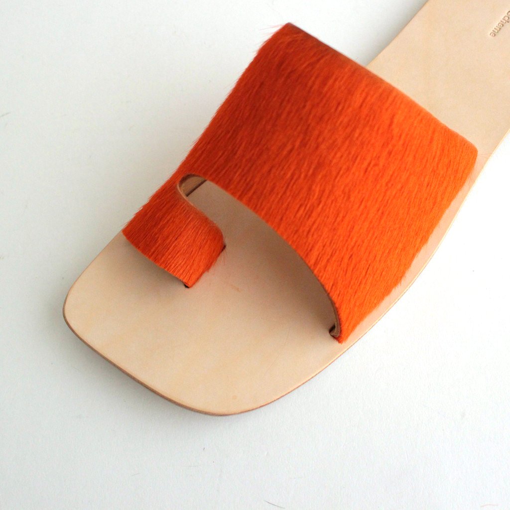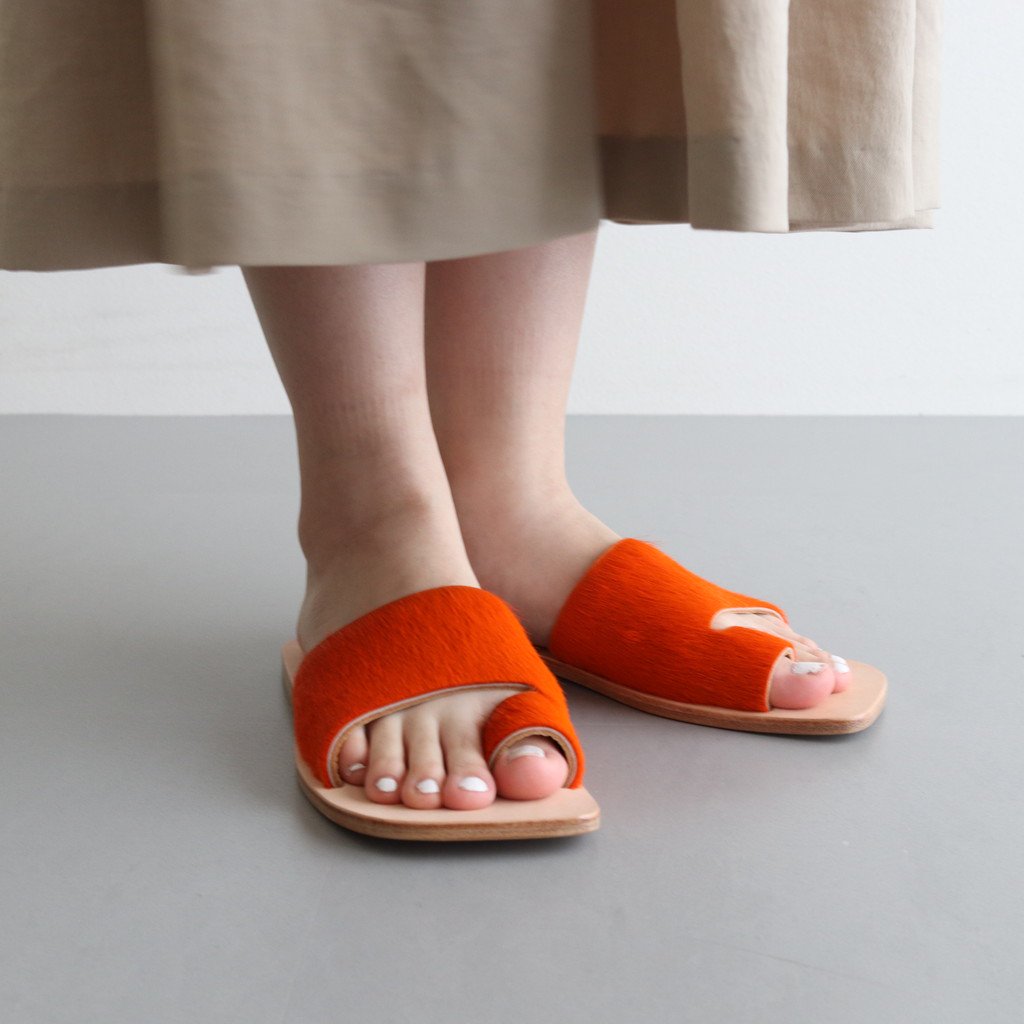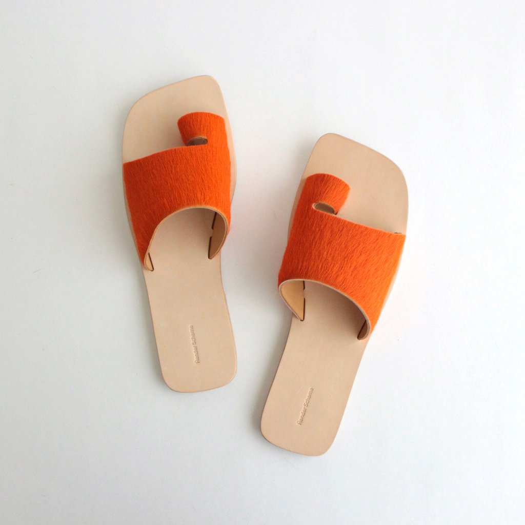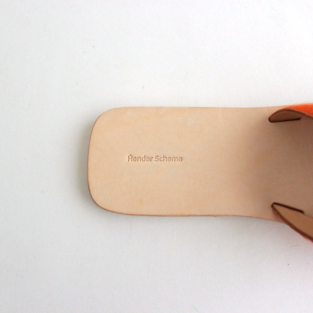Hender Schemeがレザーサンダル「ARJAH」。色鮮やかなアッパーがハッと目を引くHender Schemeらしい斬新なサンダルです。アッパーには毛付きのカウレザーを使用。インポートの毛付きのカウレザーは目を引く発色の良さが特徴。アッパーの発色の良さを生かすためにサンダルのシルエットはシンプルに仕上げています。ライニングにも贅沢にカウレザーを使用。履き始めはアッパーの革やインソールがやや硬く感じますが、履き続けていくほどに心地よく、素晴らしいフィッティングを実感して頂けるかと思います。アウトソールにもレザーソールを採用。返りが良く、キメ細やかさが特徴のレザーを使用しました。ヒールにラバーを貼っているので滑りにくい作りに。踵部分に「Hender Scheme」の刻印入り。デニムでもスラックスでも、素足でもソックスでも、様々なシーンで愛用して頂けるサンダルです。