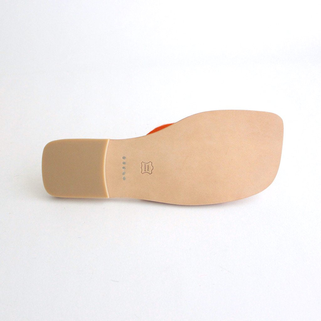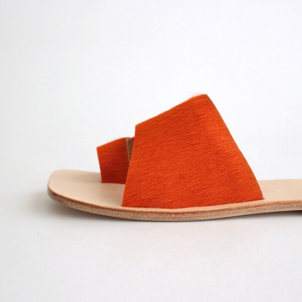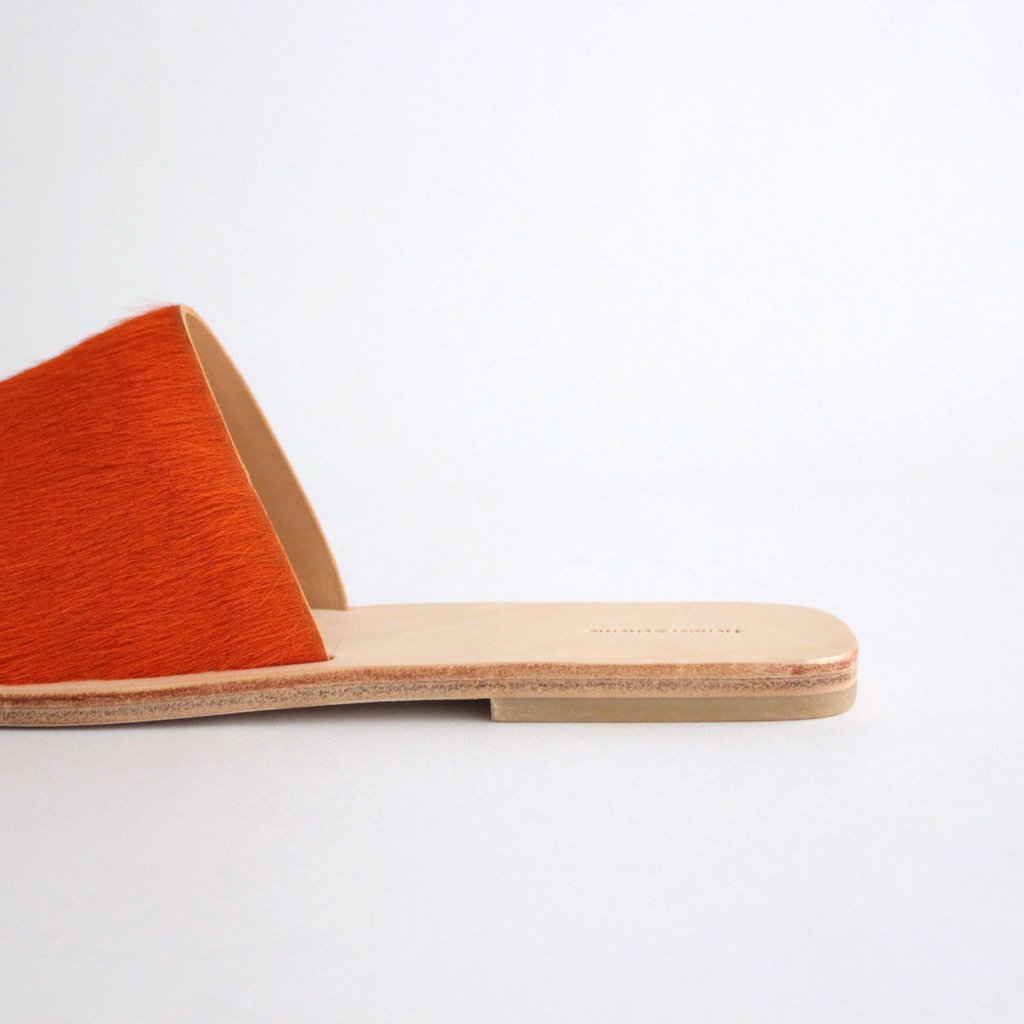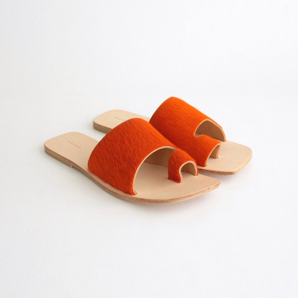 Hender Schemeがレザーサンダル「ARJAH」。色鮮やかなアッパーがハッと目を引くHender Schemeらしい斬新なサンダルです。アッパーには毛付きのカウレザーを使用。インポートの毛付きのカウレザーは目を引く発色の良さが特徴。アッパーの発色の良さを生かすためにサンダルのシルエットはシンプルに仕上げています。ライニングにも贅沢にカウレザーを使用。履き始めはアッパーの革やインソールがやや硬く感じますが、履き続けていくほどに心地よく、素晴らしいフィッティングを実感して頂けるかと思います。アウトソールにもレザーソールを採用。返りが良く、キメ細やかさが特徴のレザーを使用しました。ヒールにラバーを貼っているので滑りにくい作りに。踵部分に「Hender Scheme」の刻印入り。デニムでもスラックスでも、素足でもソックスでも、様々なシーンで愛用して頂けるサンダルです。