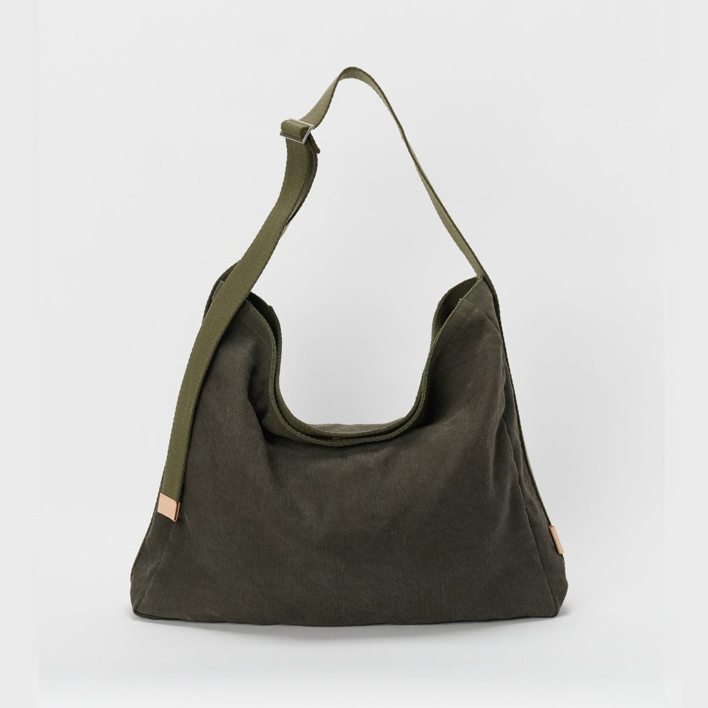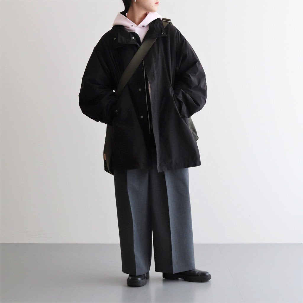収容部分の四角い形が特徴的な肩掛けバッグ。全体にコットンとジュートをミックスしたツイル生地を使用。撚りの甘い糸を粗めに織ることによって敢えて毛羽を立たせ、立体的で粗野な風合いの生地に仕上げています。ストラップ部分には上部なコットンテープが用いられており、斜め掛けも可能な長めの設計となっています。テープの端やブランドタブにはエンダースキーマらしいレザーを配置。バッグ内部には小さいポケットやマグネットなども設計されており、細部にも拘ったバッグに仕上がっています。