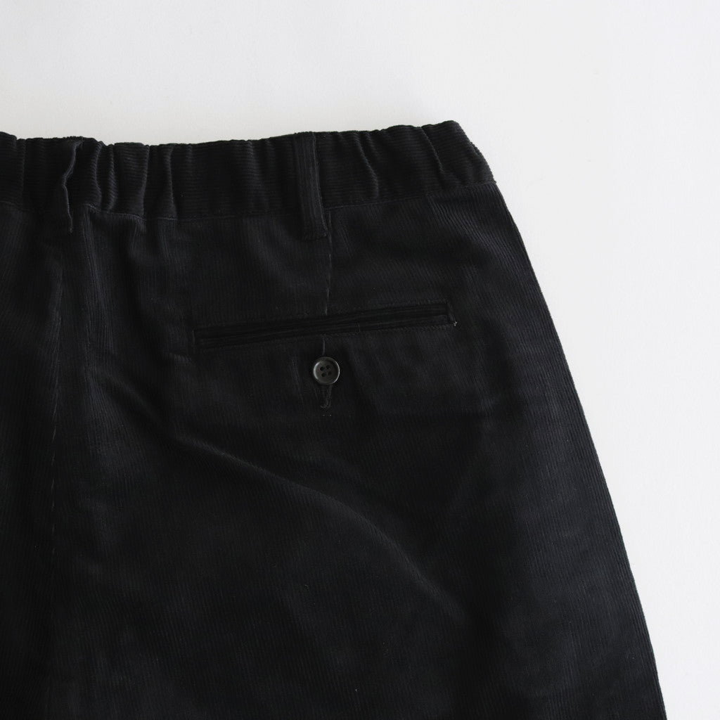 ジャストサイズではなく、オーバーサイズを絞って穿くイメージで作られたシルエット。単に絞るだけではウエスト周りが美しくないという問題点を、ウエストにゴムを入れ、さらにドローコードを通すことで解消。フロントに大きく入った2タックやダブルで仕上げた裾など、アメリカントラディショナルなディテールとオーバーサイズのシルエットを融合させたTap Waterらしいコーデュロイパンツです。