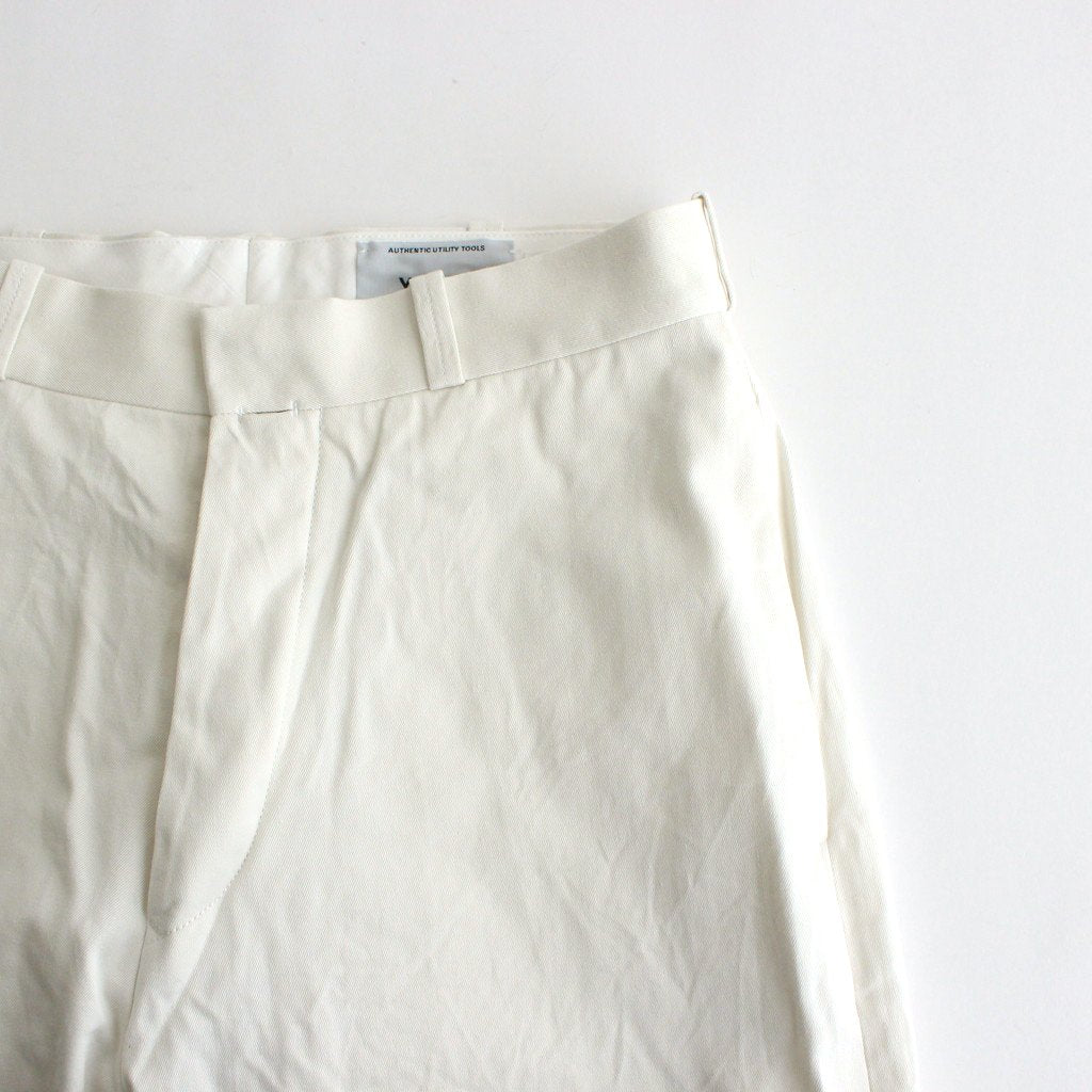 YAECAの定番モデルとして長く愛されているオーセンティックな佇まいのチノパン。糸の選定から生地を織り上げるまでの全工程に拘り、YAECAがオリジナルで製作した耳付きのコットンチノクロス(セルビッジ)を使用。シーズンレスに着用可能なレギュラーオンスの生地厚、少しのハリとコシ、織り方と糸の風合いから生まれるYAECAならではの優しく、落ち着いた雰囲気が特徴の生地です。製品後にワンウォッシュを掛け、天日乾燥仕上げにすることで自然なシワ感を演出し、生地を馴染ませています。脇線に沿って配した実用性に優れたバーティカルスリットポケット、右ポケット付近には「時計隠し」と呼ばれるフォブポケットをデザインしています。バックはボタン留めの片玉縁ポケットです。ジッパーフライデザイン。