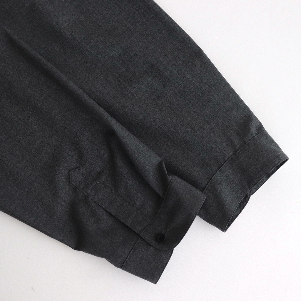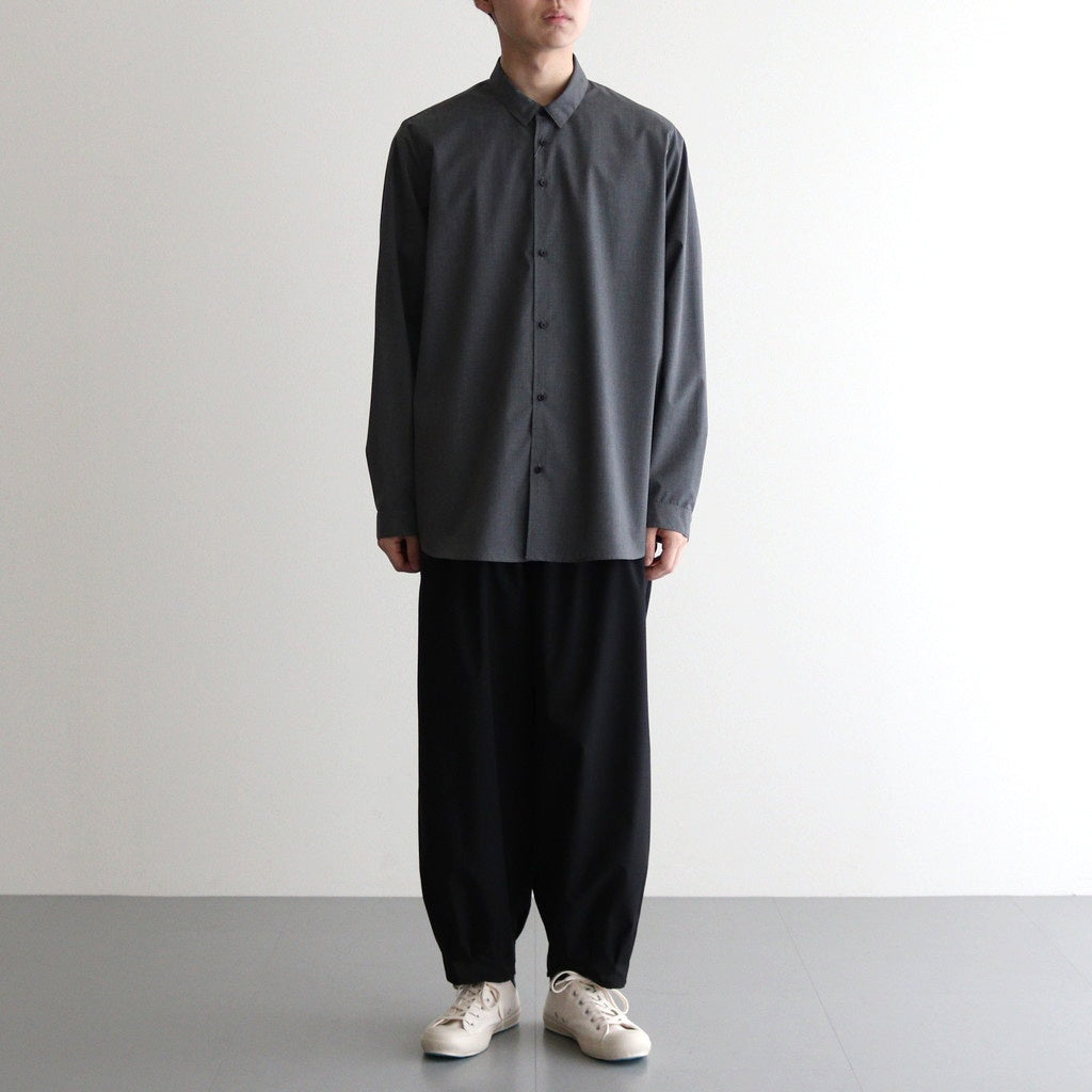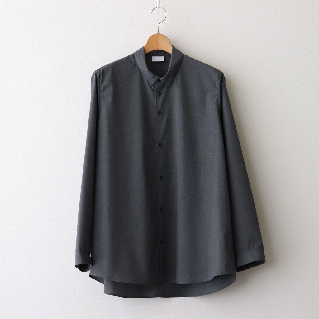 肩幅・身幅を比較的コンパクトなサイズ感で製作されたレギュラーカラーシャツ。襟は主張の少ない小さめな台襟仕様。袖付けはセットインスリーブ。裾はラウンドカットで着丈に前後差をつけたデザインです。