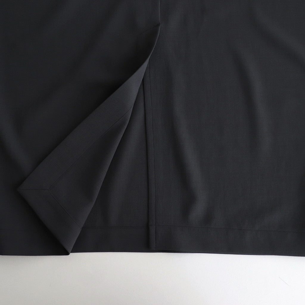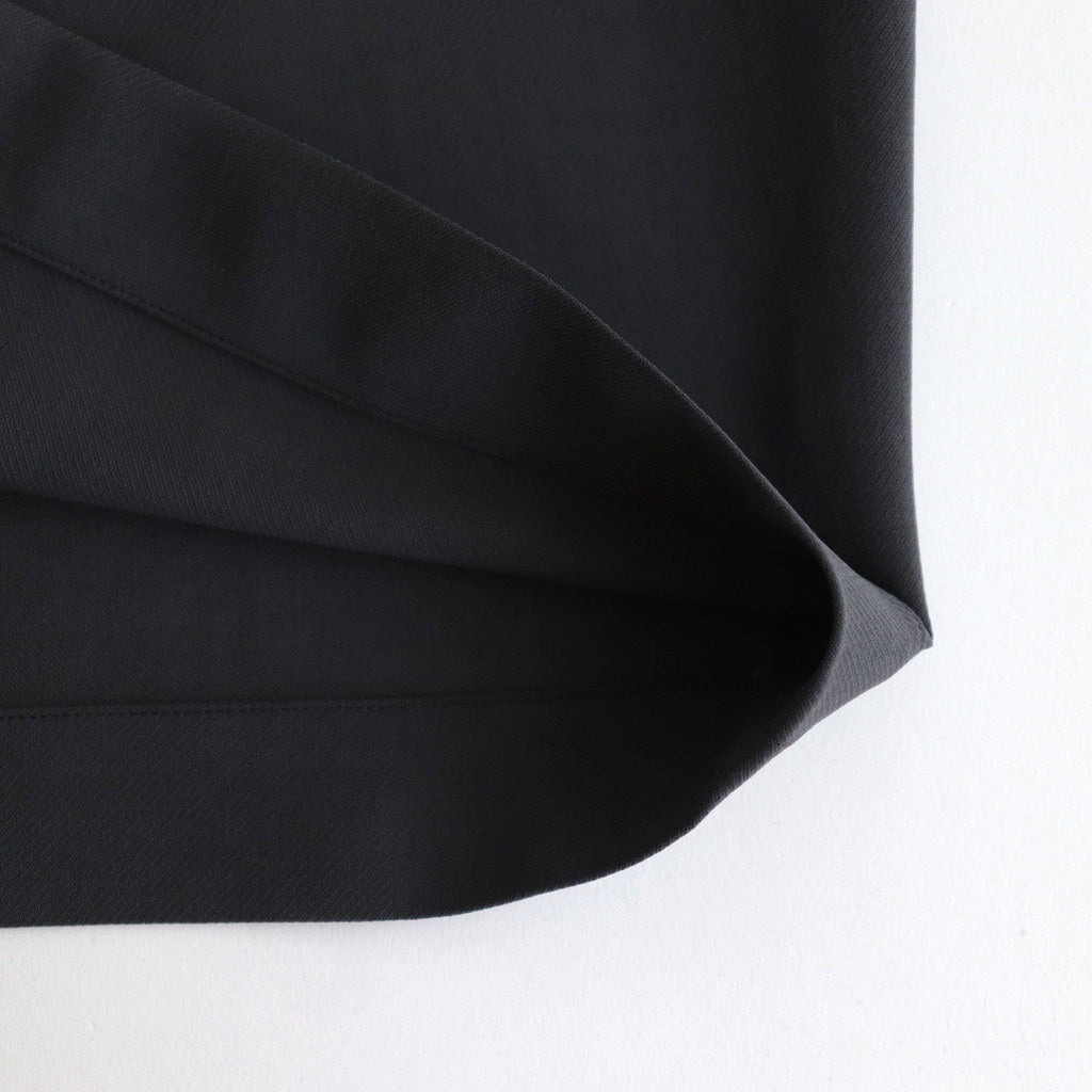 生地全面に強撚のポリエステル糸を使用。太い部分と細い部分がある不揃いの糸を使用することで杢調の生地に仕上げています。一般的にはドライな生地感になることの多い強撚糸ですが、特殊な加工によってふっくらと柔らかくナチュラルな風合いを持ち合わせた風合いに。ストレッチ性と落ち感がありシワにもなりにくく、一見繊細な生地にも見えますがご家庭でのお洗濯も可能なイージーケア素材です。